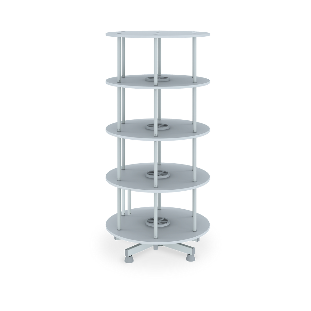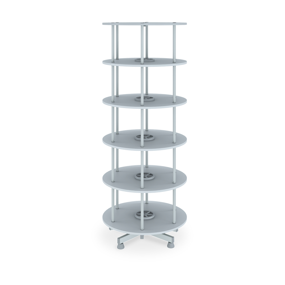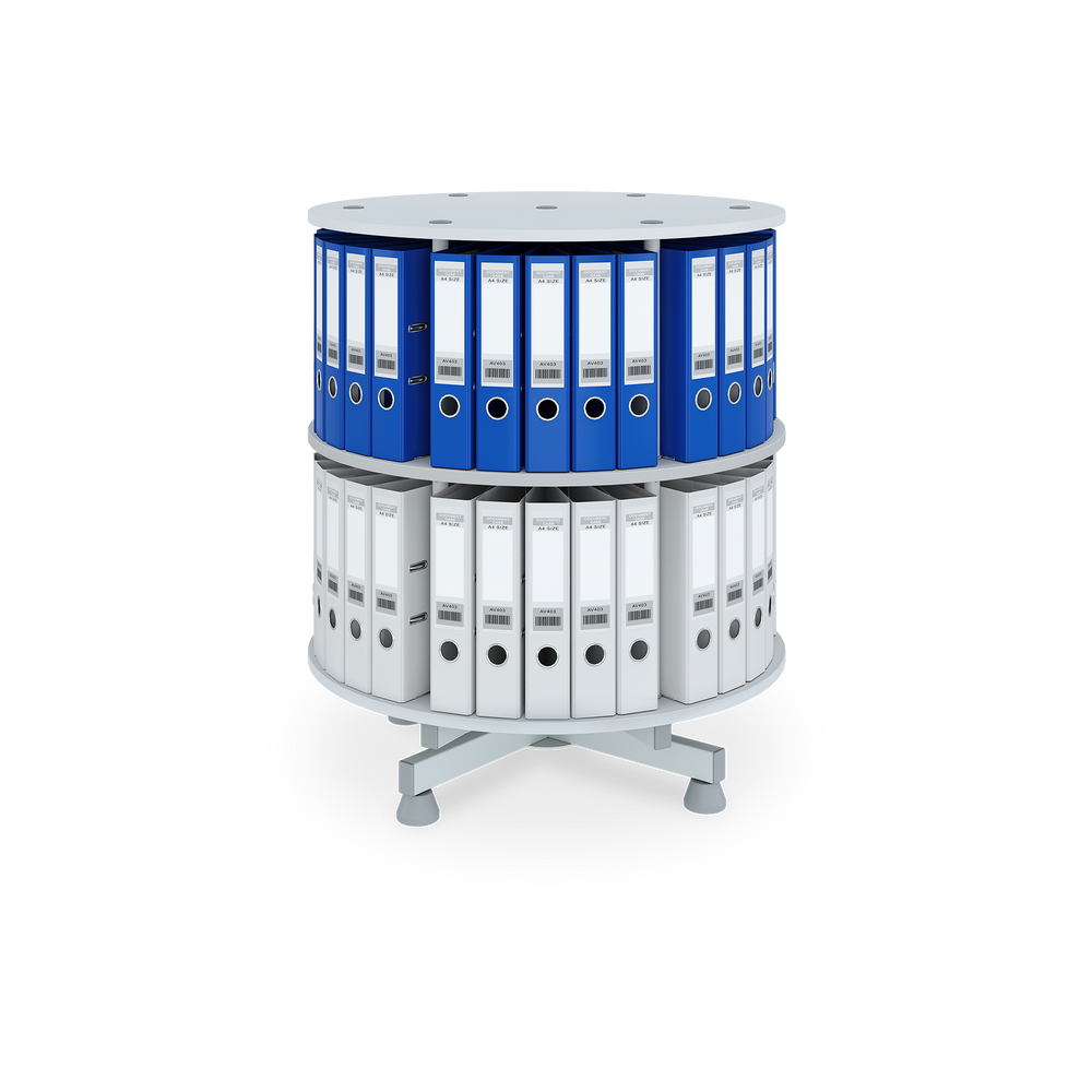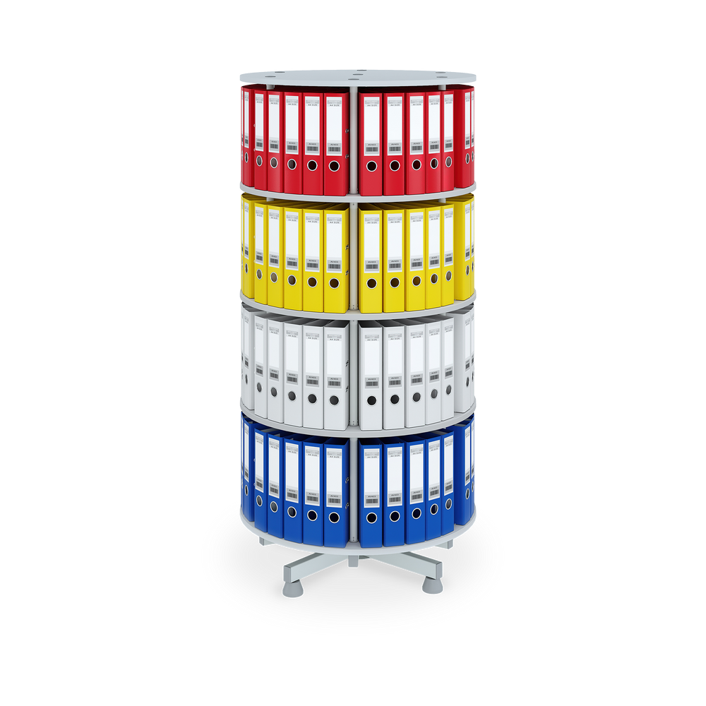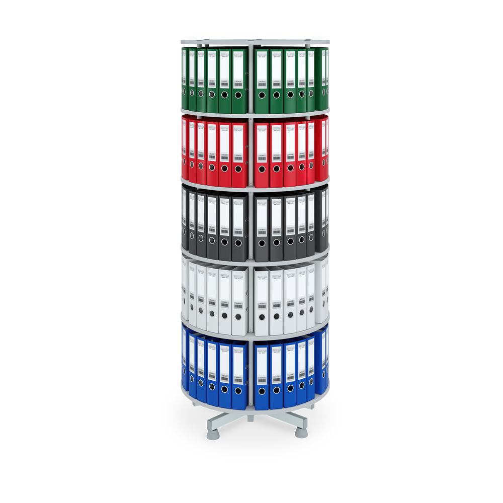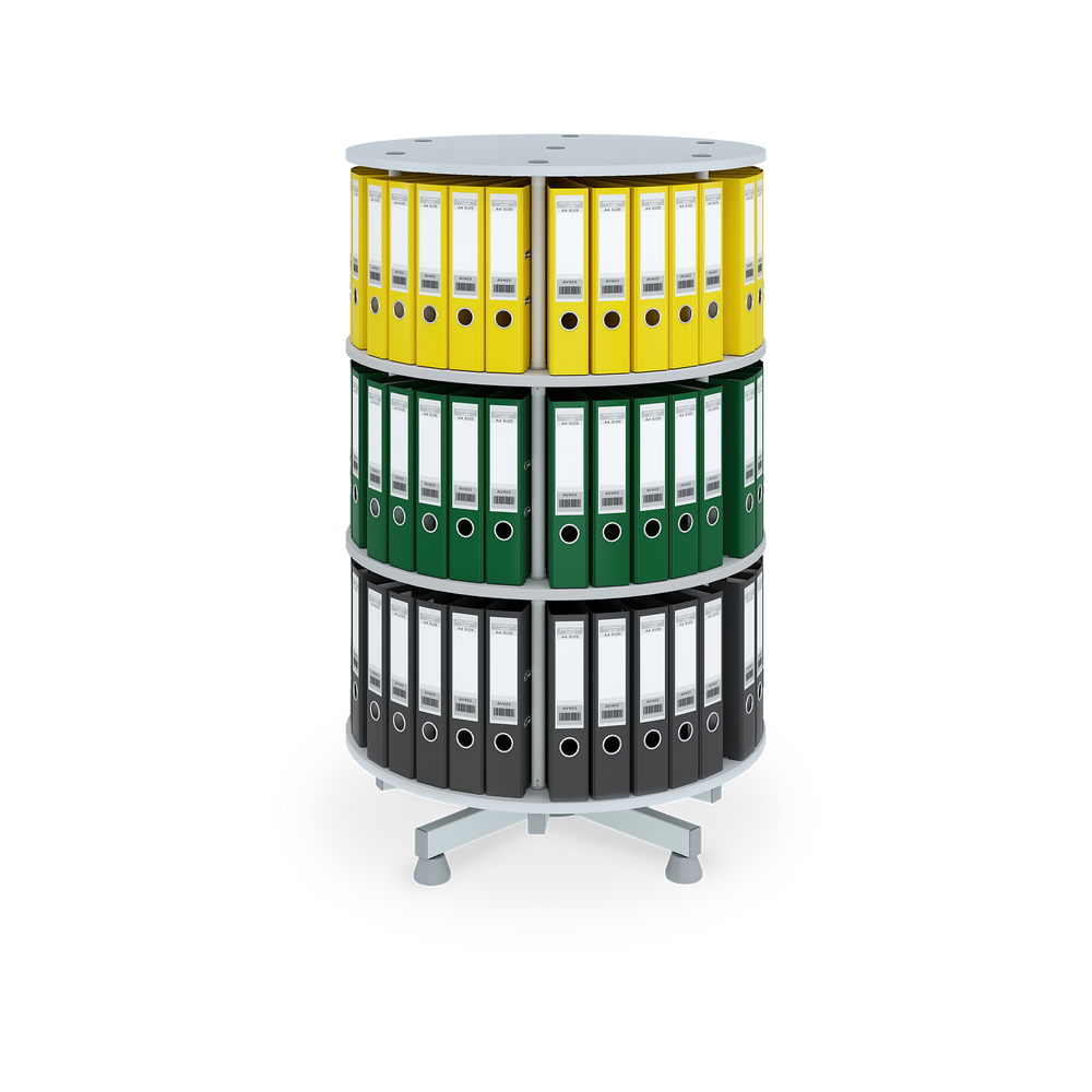 Jede Ebene der Säule ist so konzipiert, dass sie bis zu 24 Standardordner aufnehmen kann, was einen schnellen und unkomplizierten Zugriff auf alle wichtigen Unterlagen ermöglicht. Die einzelnen Etagen sind fest miteinander verbunden, sodass sich alle Einheiten synchron und mühelos gemeinsam drehen lassen.