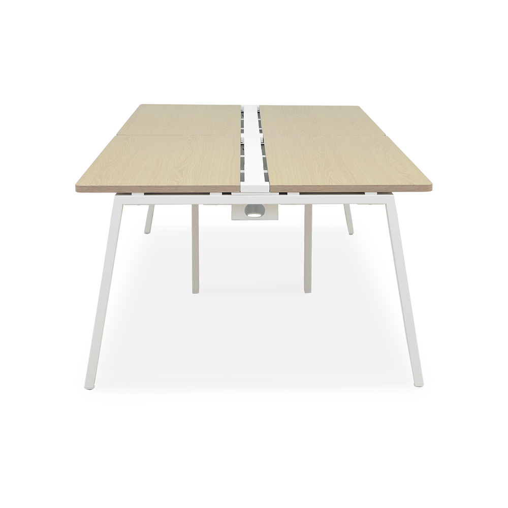 Getragen wird die Platte von einem stabilen Stahl-Fußgestell, das durch eine Pulverbeschichtung in Reinweiß (RAL 9010) veredelt ist und für maximale Stabilität sorgt. Dank der integrierten Bodenausgleichsfüße lässt sich der Tisch auch auf unebenen Böden sicher und wackelfrei aufstellen. Für ein aufgeräumtes Kabelmanagement kann der Konferenztisch optional mit einem Kabelkanal ausgestattet werden.