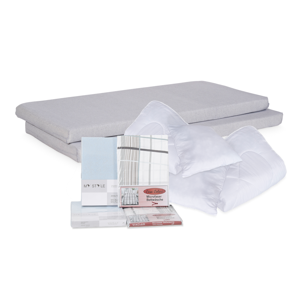 Es beinhaltet zwei Schaumstoffmatratzen (1900 x 800 x 80 mm) mit waschbarem Bezug, zwei Kissen (800 x 800 mm), zwei Einziehdecken (2000 x 1350 mm), zwei Bettwäsche-Sets aus Polyester in bunten Farben und zwei Spannbettücher aus Baumwolle/Polyester-Mischgewebe.