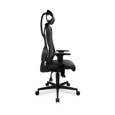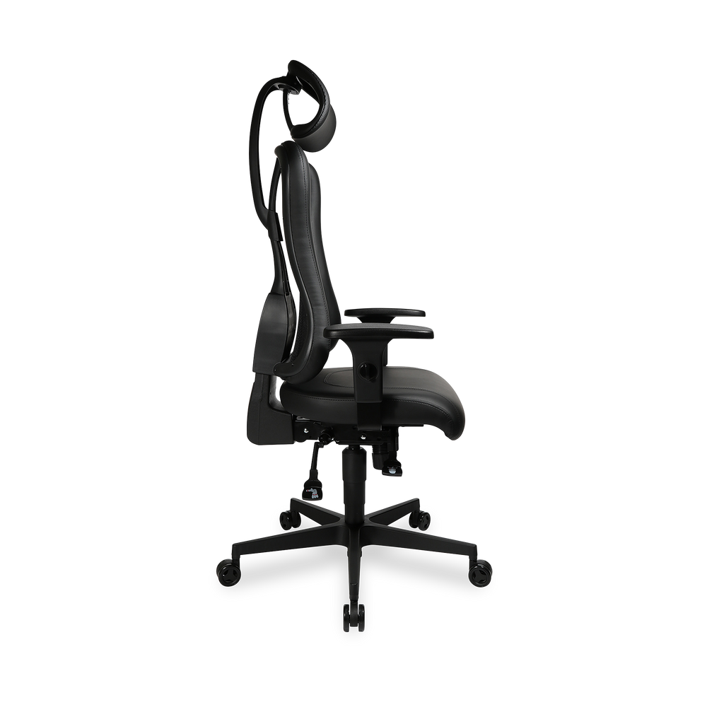 Der Stuhl steht auf einem großen und standsicheren Kunststoff-Fußkreuz in Schwarz und ist mit lastabhängig gebremsten Sicherheitsdoppelrollen für Teppichböden im Speichen-Design ausgestattet. Für zusätzlichen Komfort sorgen die höhen- und neigungsverstellbare Kopfstütze und die höhenverstellbaren Armlehnen.