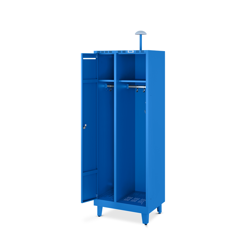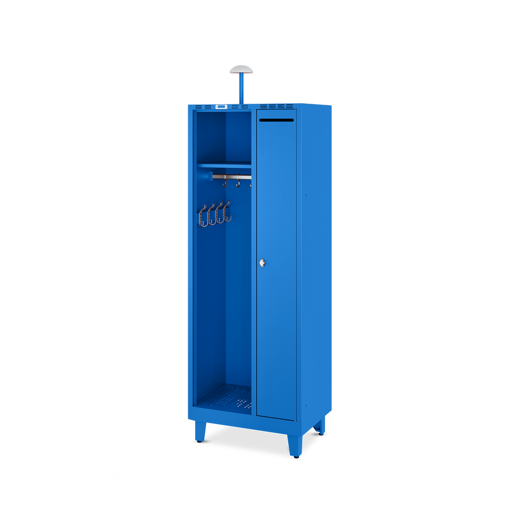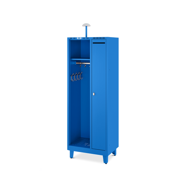 Der Feuerwehr-Einsatzspind (für 1 Person) in Enzianblau (RAL 5010) bietet eine praktische und übersichtliche Aufbewahrungslösung für die persönliche Schutzausrüstung von Einsatzkräften. Der Spind ist in zwei Abteile mit Breiten von 400 mm und 300 mm unterteilt und verfügt über einen Hutboden, eine Kleiderstange sowie zwei Haken. Die Feuerwehrspinde sind für SW-Trennung (Schwarz / Weiß Trennung bzw. Trennung von Straßen- & Arbeitskleidung) konzipiert.
