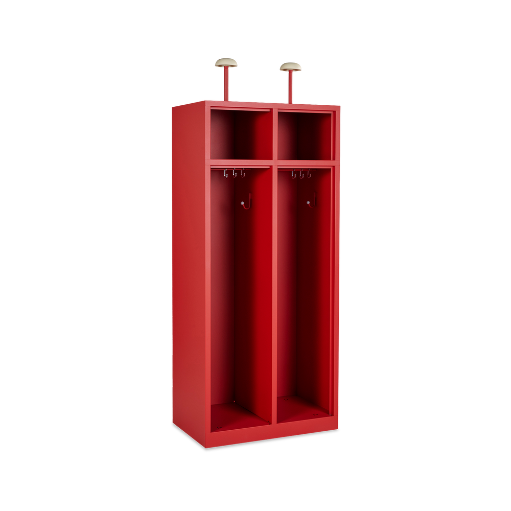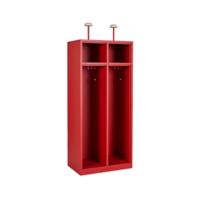Der Feuerwehrschrank (2 Abteile) in Feuerrot (RAL 3000) ist die ideale Lösung zur sicheren Aufbewahrung von Feuerwehr-Ausrüstung. Der Schrank verfügt über einen komplett verschweißten Korpus, der für maximale Stabilität sorgt und auf einem Sockel steht. Im Abteil befinden sich eine Kleiderstange, ein Helmhalter und fünf Haken, die ausreichend Platz für die persönliche Schutzausrüstung bieten.