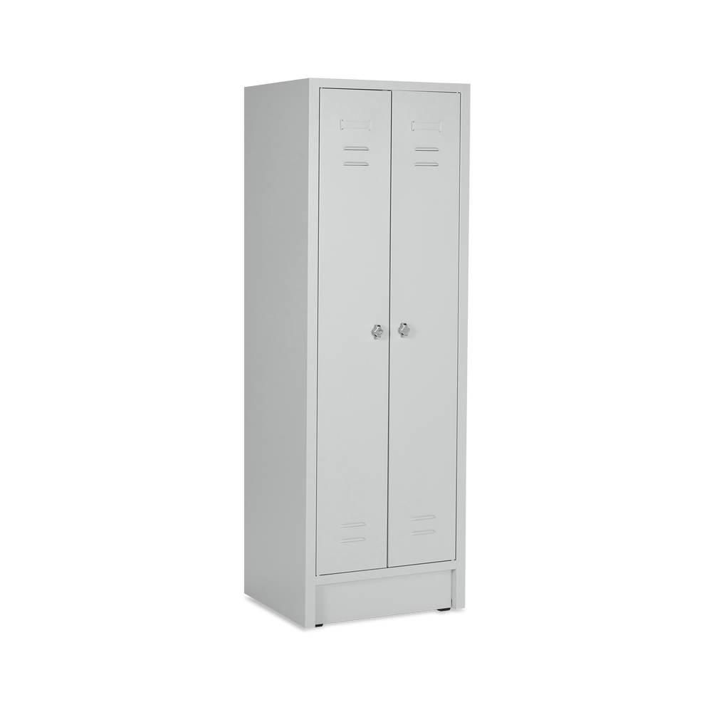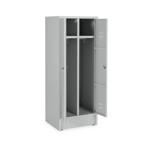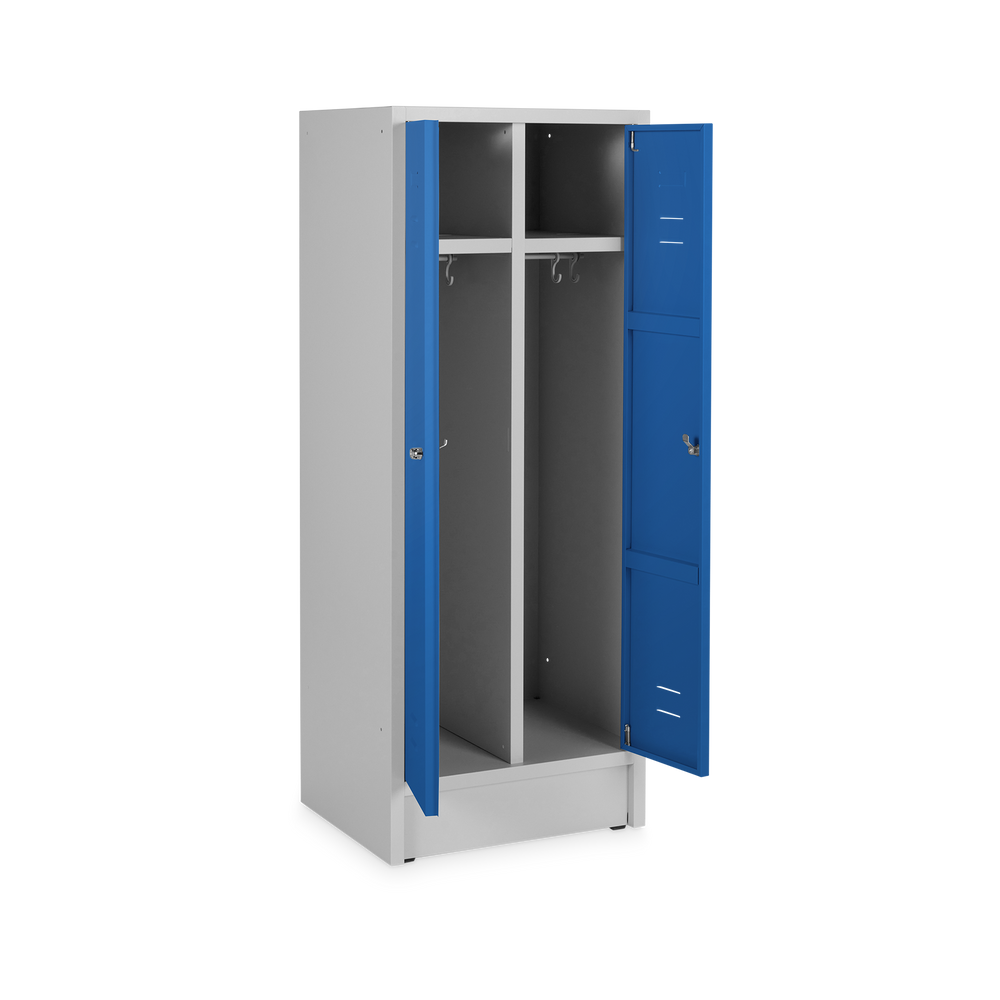 Dieser TÜV geprüfte Doppelspind ohne Fachböden (Zertifikat Nr. S 60184163) ist die ideale Lösung zur Aufbewahrung von Kleidung und persönlichen Gegenständen in Umkleideräumen, Schulen oder Betrieben. Er verfügt über zwei Abteile mit je einem Hutboden und einer Kleiderstange aus Metall mit zwei verschiebbaren Kleiderhaken aus Kunststoff.
