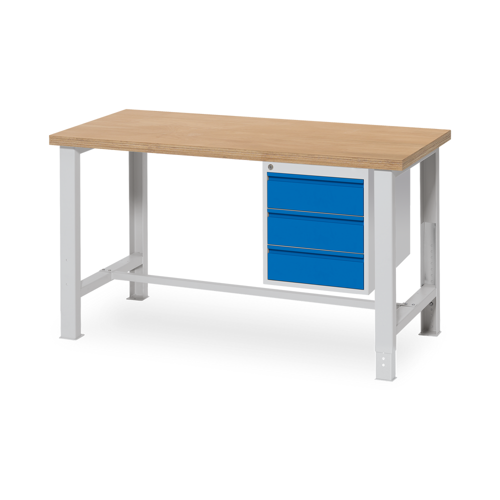 Der Unterbaucontainer kann flexibel links oder rechts unter der Arbeitsplatte montiert werden, um den Arbeitsplatz individuell zu gestalten. Die leichtgängigen Schubladen laufen auf hochwertigen Teleskopschienen mit 100% Vollauszug und bieten eine Traglast von jeweils 50 kg. Ein Zentralverschluss mit Zylinderschloss sichert Werkzeuge und Materialien zuverlässig vor unbefugtem Zugriff.