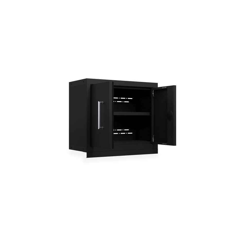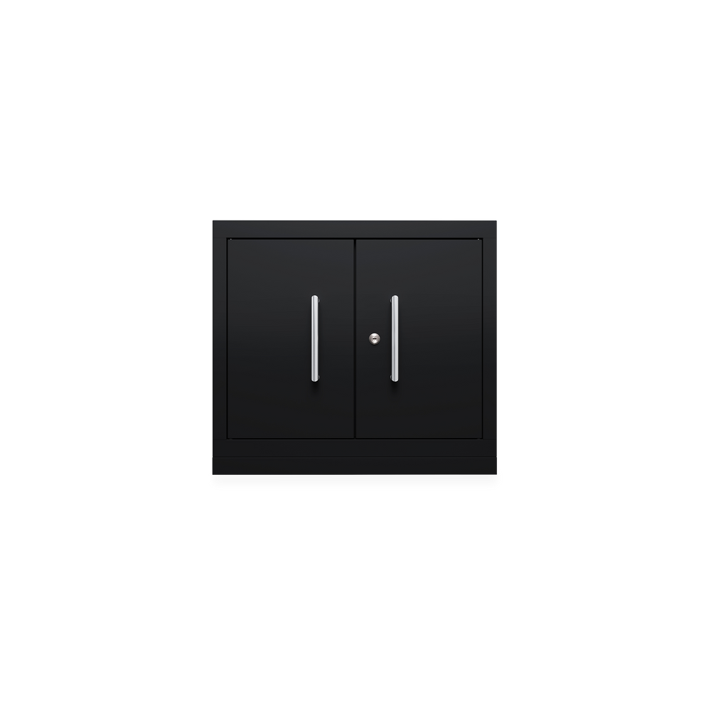 Technisch überzeugt das Modell durch zwei glatte Türen mit einem Öffnungswinkel von 90°, die mit hochwertigen Chromgriffen ausgestattet sind. Ein Magnetverschluss in Kombination mit einem Zylinderschloss sorgt für eine sichere und komfortable Handhabung. Im Innenraum befindet sich ein höhenverstellbarer Fachboden mit einer Tragkraft von ca. 70 kg, der auch für die Lagerung schwererer Werkzeuge oder Materialien ausgelegt ist. Das erforderliche Montagematerial für die Verbindung mehrerer Schränke ist im Lieferumfang enthalten.