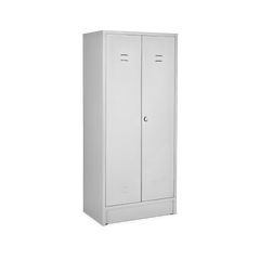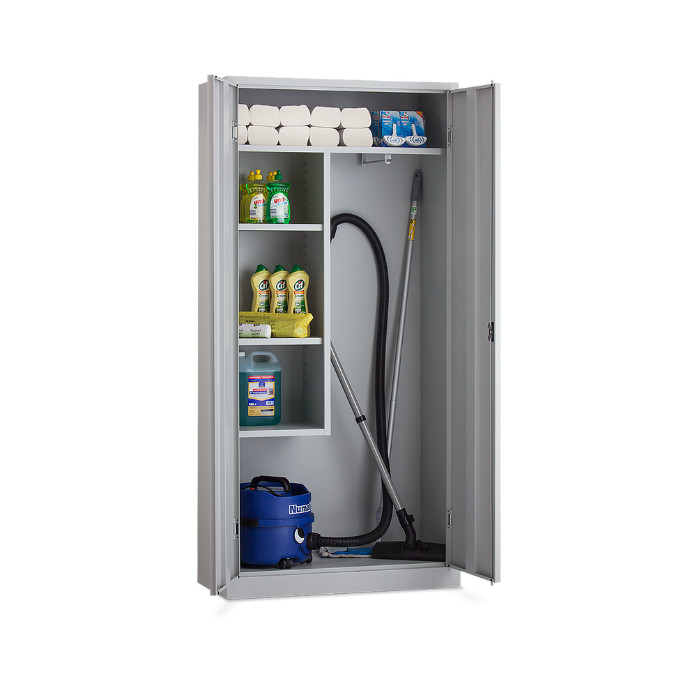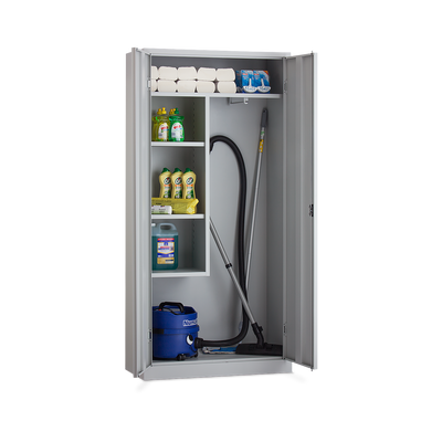 Der Putzmittelschrank in Lichtgrau (RAL 7035) bietet eine sichere und stabile Aufbewahrungslösung für Reinigungsmittel und -utensilien. Der verschweißte Korpus und der stabile Sockel gewährleisten hohe Standfestigkeit. Durch die 180° Türöffnung mit innenliegenden Scharnieren ist ein einfacher Zugriff auf den Inhalt garantiert.