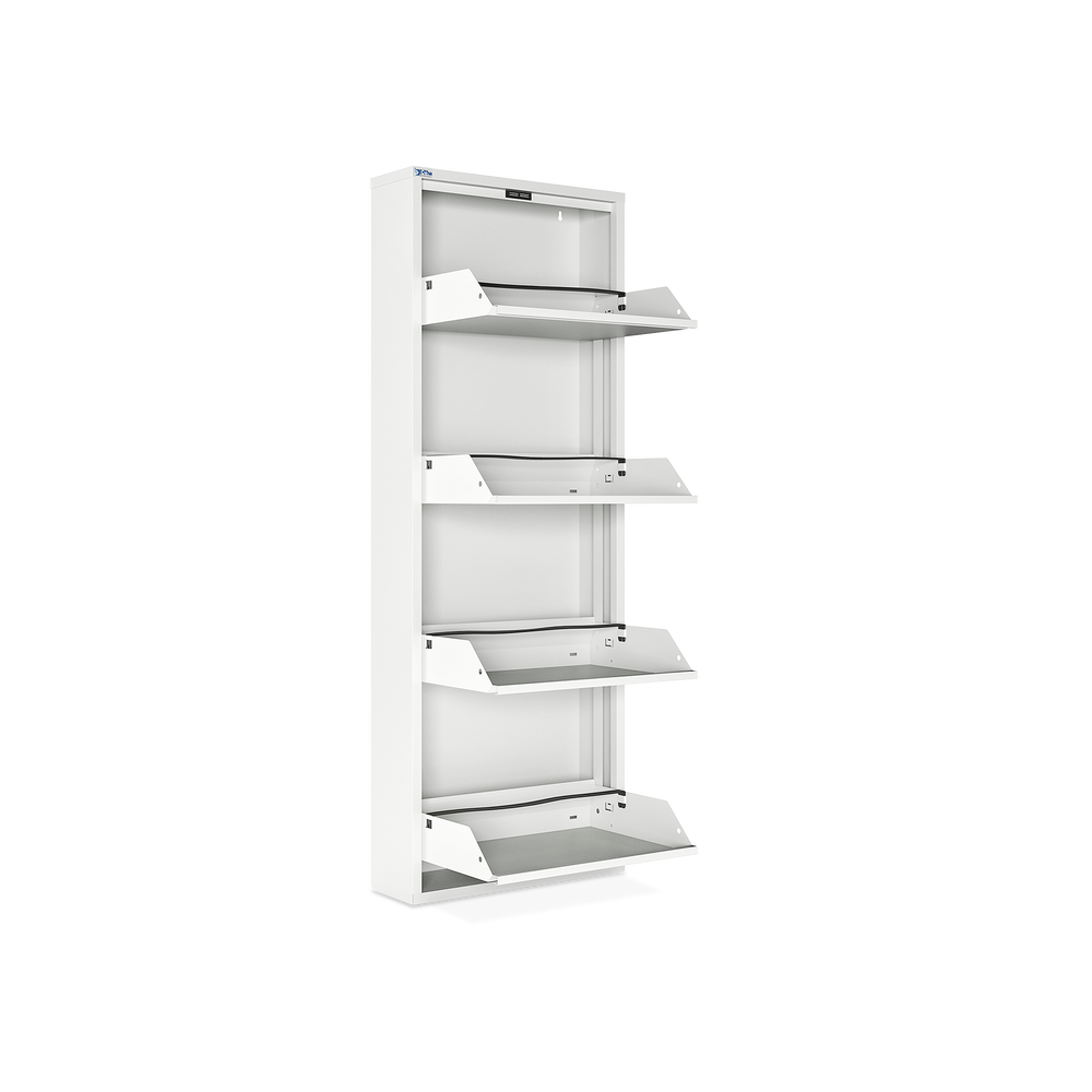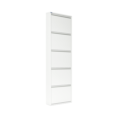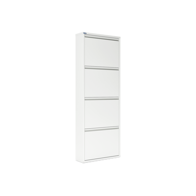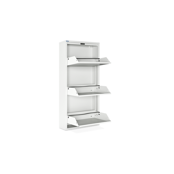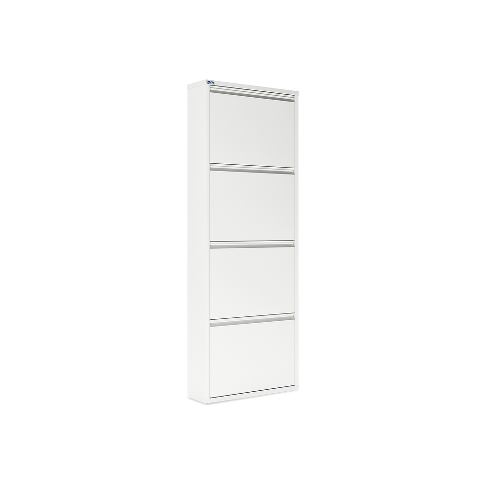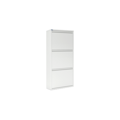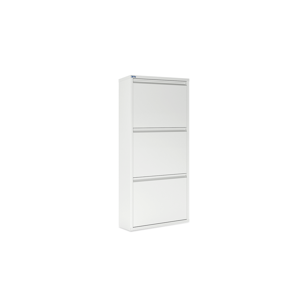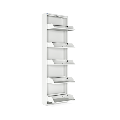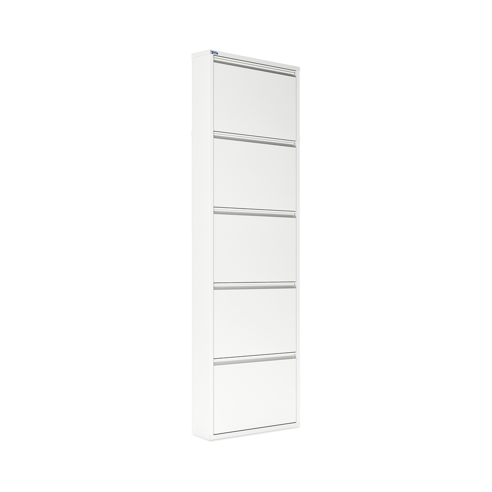 Der Schuhkipper aus pulverbeschichtetem Stahlblech in Cremeweiß (RAL 9003) ist die ideale Lösung, um Ihre Schuhe platzsparend und ordentlich zu verstauen. Mit 3/4/5 Klappen bietet er Platz für 6/8/10 Paar Schuhe. Jede Klappe ist mit schwarzen Kunststoffhalterungen ausgestattet, die Ihre Schuhe sicher und schonend fixieren.