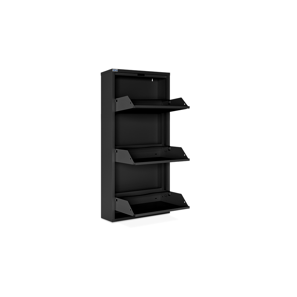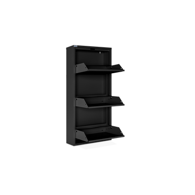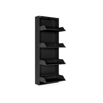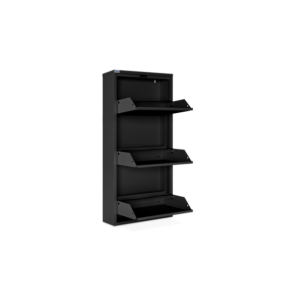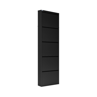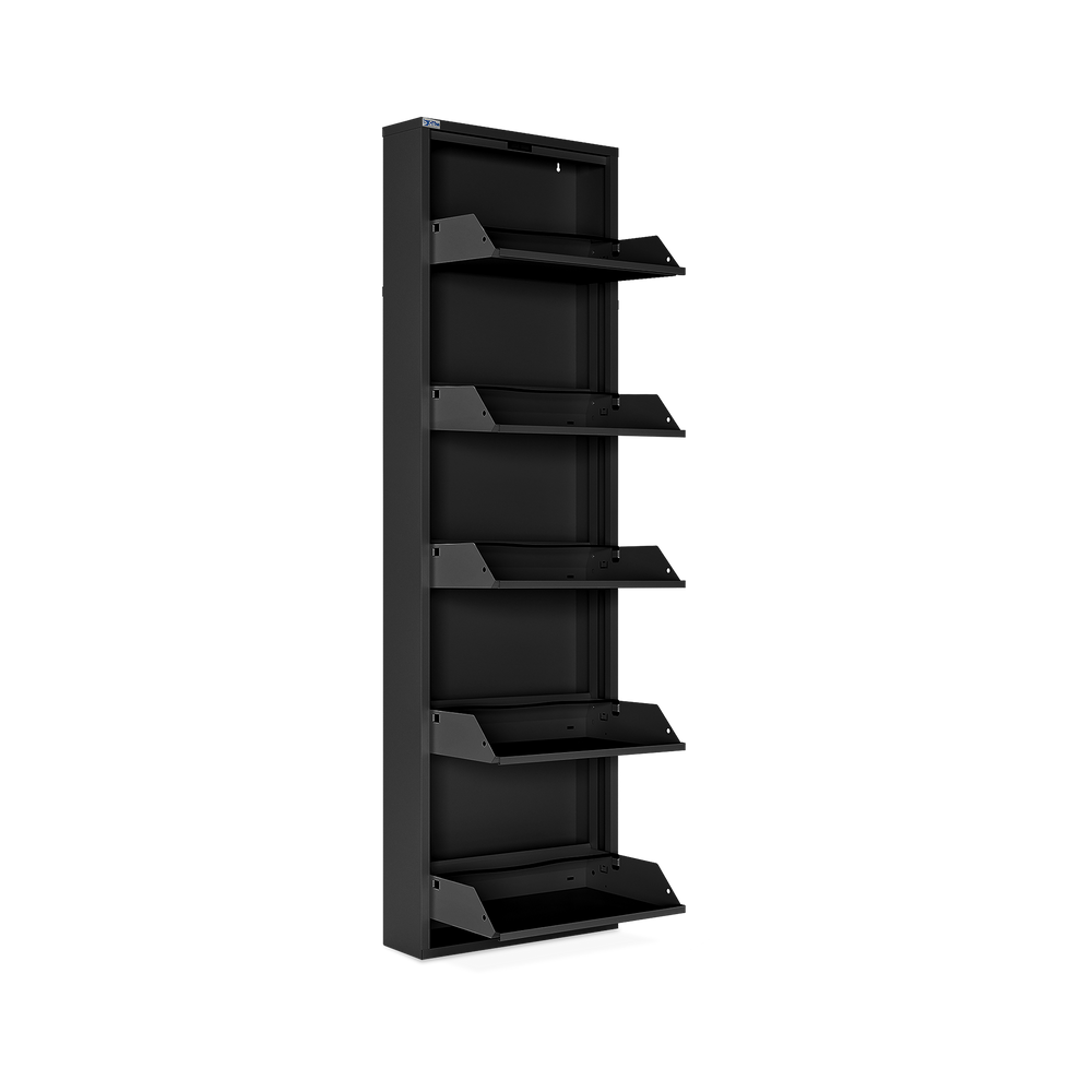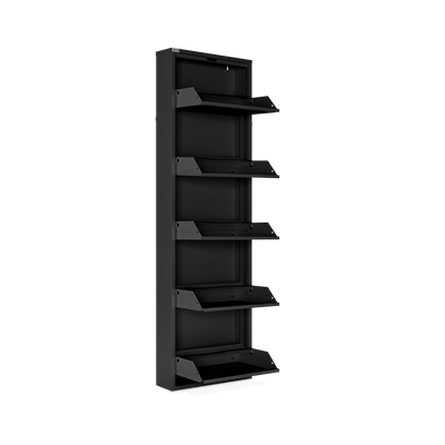 Der Schuhkipper aus pulverbeschichtetem Stahlblech in Tiefschwarz (RAL 9005) ist die ideale Lösung, um Ihre Schuhe platzsparend und ordentlich zu verstauen. Mit 3/4/5 Klappen bietet er Platz für 6/8/10 Paar Schuhe. Jede Klappe ist mit schwarzen Kunststoffhalterungen ausgestattet, die Ihre Schuhe sicher und schonend fixieren.