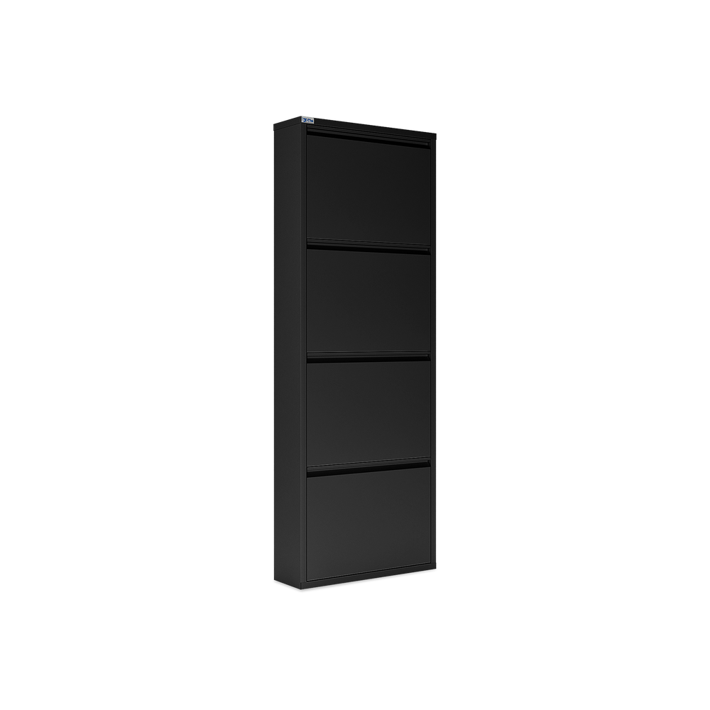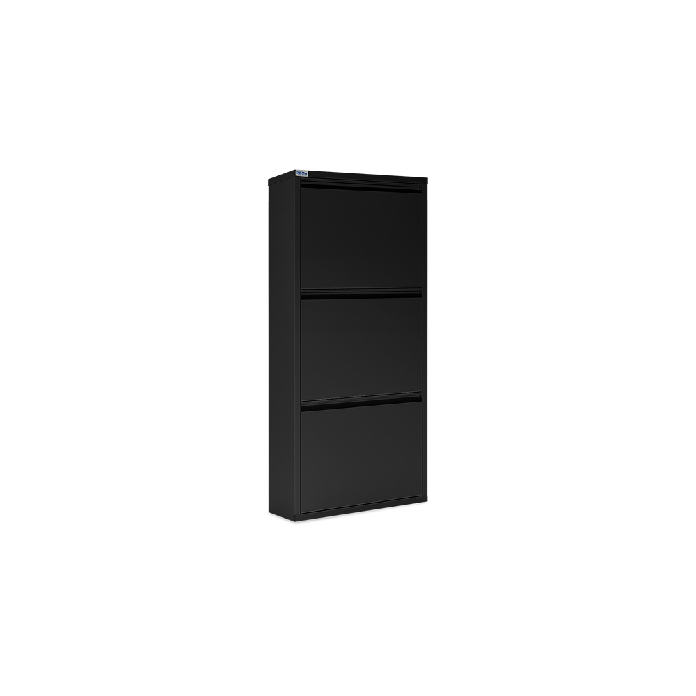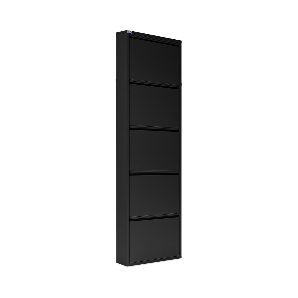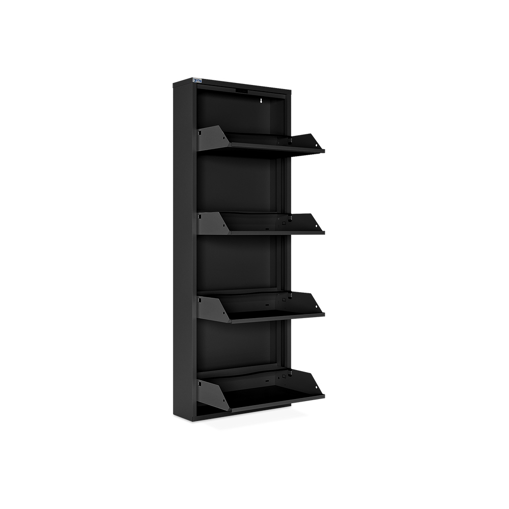 Der Schuhkipper aus pulverbeschichtetem Stahlblech in Tiefschwarz (RAL 9005) ist die ideale Lösung, um Ihre Schuhe platzsparend und ordentlich zu verstauen. Mit 3/4/5 Klappen bietet er Platz für 6/8/10 Paar Schuhe. Jede Klappe ist mit schwarzen Kunststoffhalterungen ausgestattet, die Ihre Schuhe sicher und schonend fixieren.