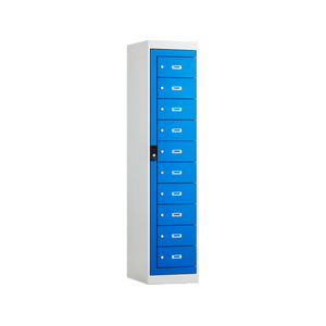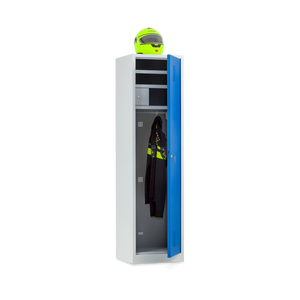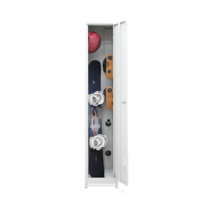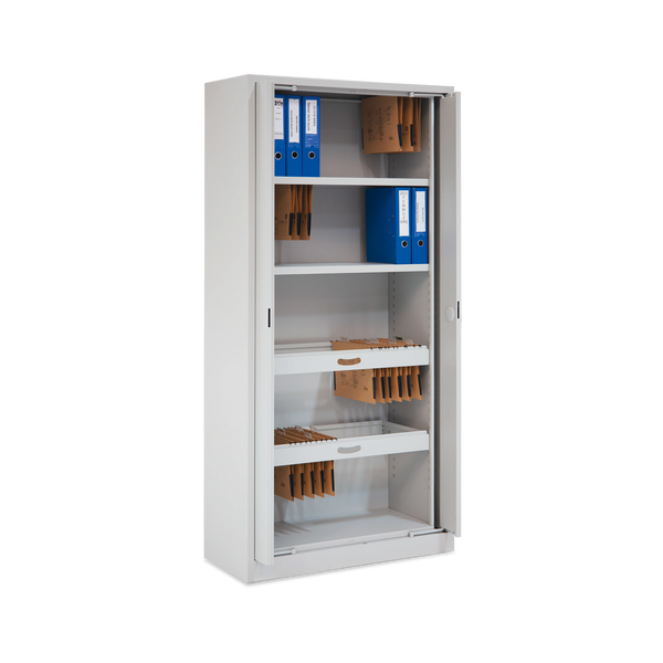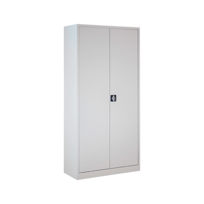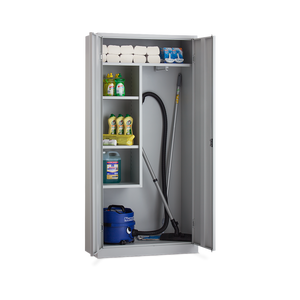 Der Einschwenktürenschrank in Lichtgrau (RAL 7035) überzeugt durch seine innovative Türkonstruktion. Die Türen öffnen sich geräuscharm und schwenken seitlich in den Korpus ein, wodurch Platz gespart und ein komfortabler Zugriff auf den Inhalt ermöglicht wird. Der robuste, verschweißte Korpus gewährleistet Stabilität und Langlebigkeit.