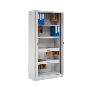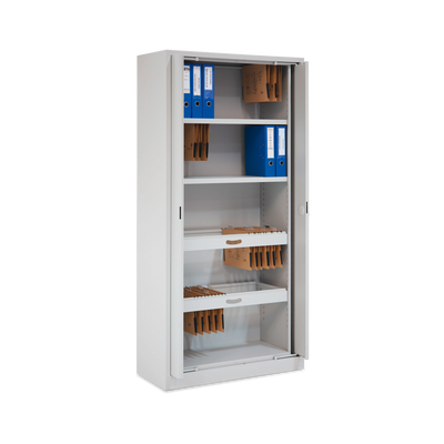 Im Inneren des Schranks befinden sich verstellbare Fachböden, die flexible Lagermöglichkeiten bieten. Ein hochwertiges Drehzylinderschloss mit zwei Schlüsseln sichert den Inhalt vor unbefugtem Zugriff. Optional ist ein ausziehbarer Hängemappenrahmen (siehe Produktbild, nicht im Lieferumfang) erhältlich, der die Organisation von Dokumenten erleichtert.
