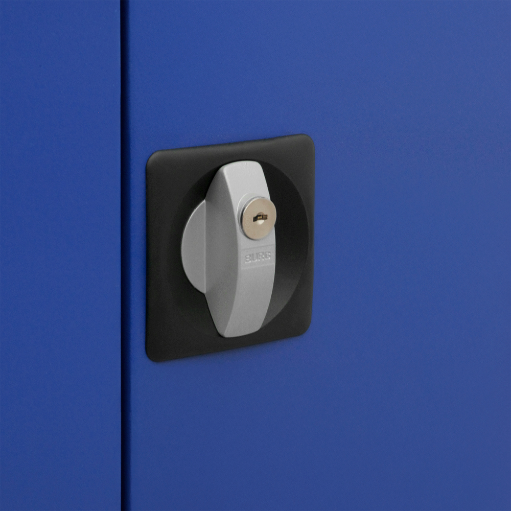 Die verstärkten Flügeltüren sind einschlagend und mit geräuschdämpfenden Gummipuffern ausgestattet, die für einen leisen Schließvorgang sorgen. Ein Schubstangen-Verschluss mit Sicherheits-Zylinderschloss und zwei Schlüsseln schützt Ihre Unterlagen vor unbefugtem Zugriff.