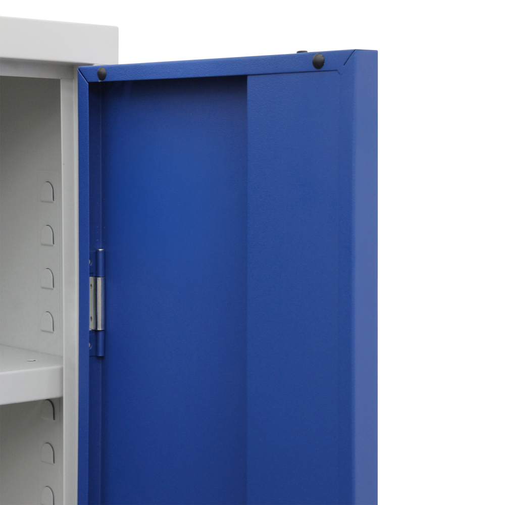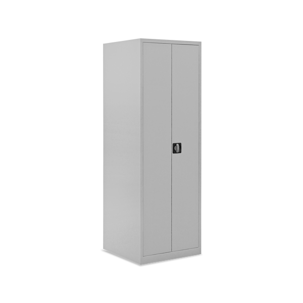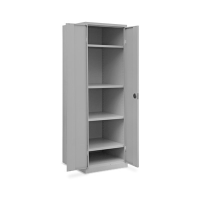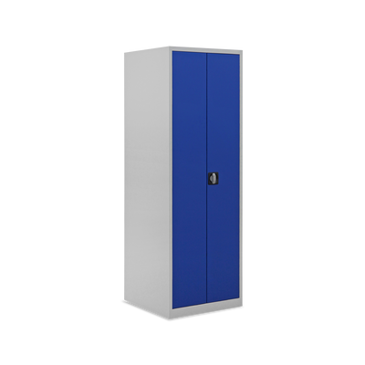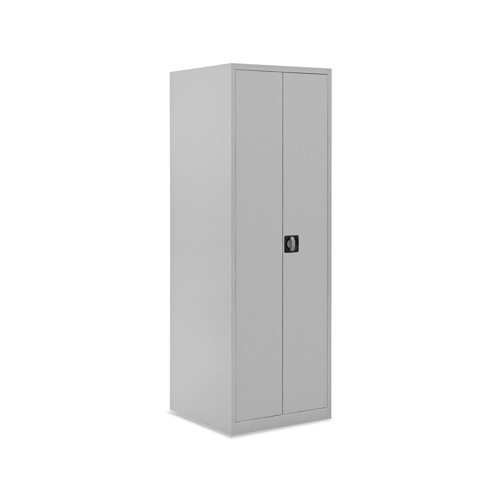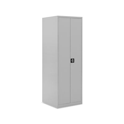 Der Schrank ist aus einer stabilen Stahlblechkonstruktion gefertigt und mit einem verschweißten Korpus und Sockel ausgestattet. Durch seine kompakten Maße 600 x 600 x 1800 mm (B x T x H) ist er ein flexibler Allrounder für wenig Platz.