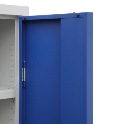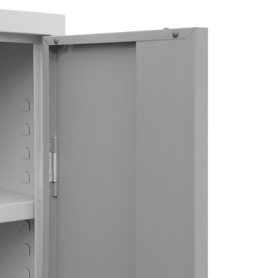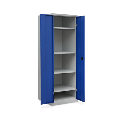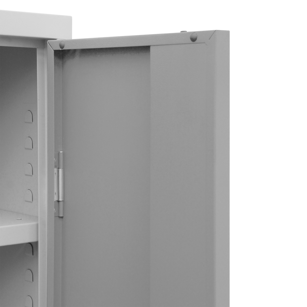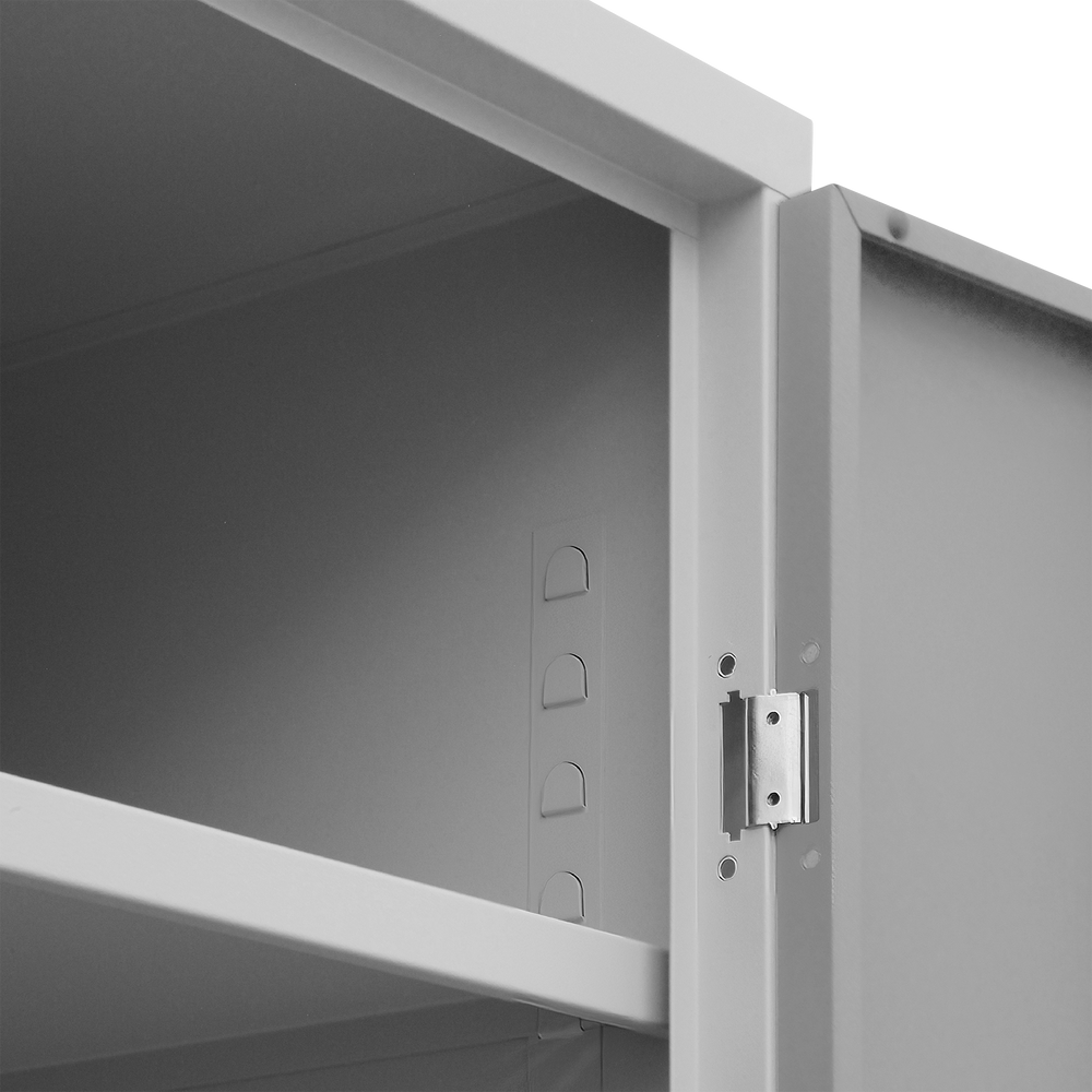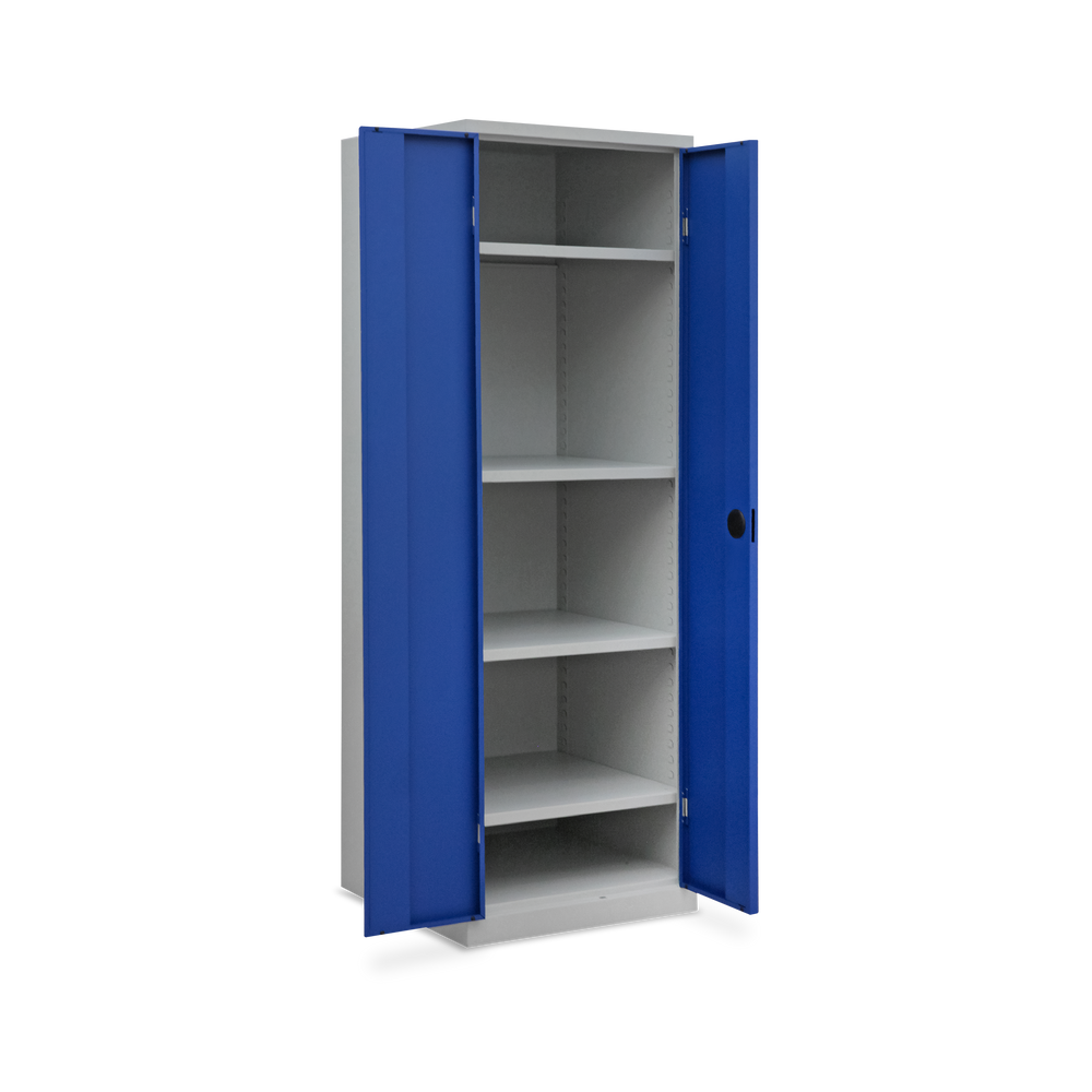 Der Schrank ist aus einer stabilen Stahlblechkonstruktion gefertigt und mit einem verschweißten Korpus und Sockel ausgestattet. Durch seine kompakten Maße 600 x 600 x 1800 mm (B x T x H) ist er ein flexibler Allrounder für wenig Platz.