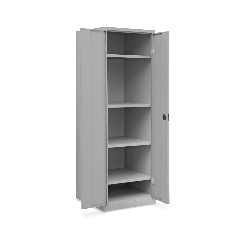 Der Schrank hat eine Höhe von 4,5 OH. Die verstärkten Flügeltüren (180° Türöffnung) sind mit geräuschdämpfenden Gummipuffern ausgestattet und schließen sicher durch ein Drehzylinderschloss.