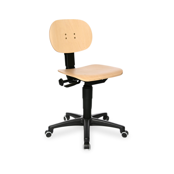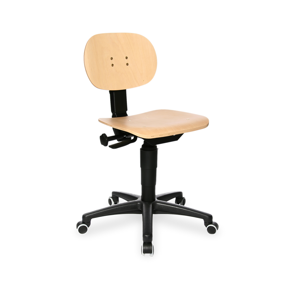 Der Arbeitsdrehstuhl mit Buchenholz bietet ergonomischen Sitzkomfort und flexible Anpassungsmöglichkeiten. Sitz und Rückenlehne sind aus schichtverleimtem Buchenholz gefertigt und ergonomisch geformt. Die kurze Rückenlehne lässt sich in Neigung und Höhe verstellen, um die optimale Sitzposition zu finden.