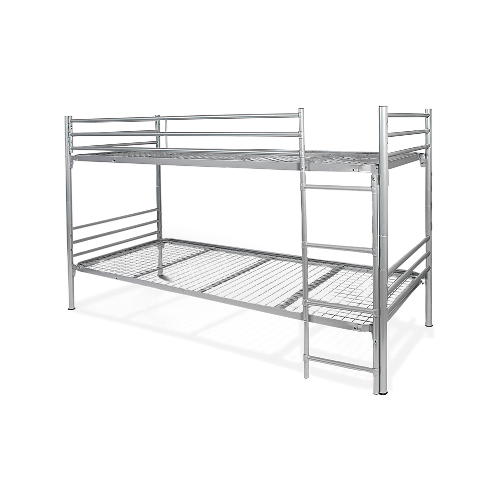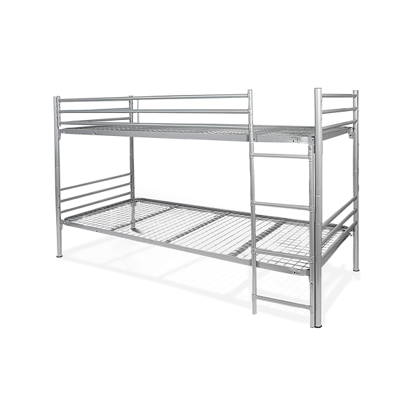 Das Sicherheits-Etagenbett aus Stahl ist umbaubar zu zwei Einzelbetten und eignet sich ideal als DIN-Bett, Wohnheim-Bett, Metallbett, Stockbett, Stahlrohr-Etagenbett bzw. Doppelstockbett. Belastbar bis 150 kg pro Liegefläche. Kopf- und Fußteile sind aus 40 mm Rundrohr gefertigt, der Einhängerahmen aus stabilem Profilrohr.