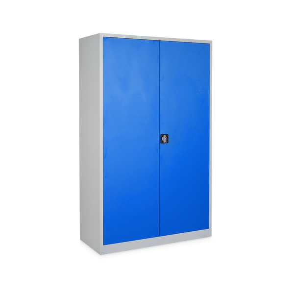 Der Schrank ist aus einer stabilen Stahlblechkonstruktion gefertigt und mit einem verschweißten Korpus und Sockel ausgestattet. Er bietet eine extra Breite mit den Maßen 1200 x 500 x 1950 mm (B x T x H) ausreichend Stauraum.
