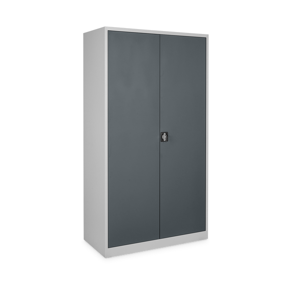 Der Schrank verfügt über 4 Fachböden, die im Raster von 35 mm höhenverstellbar sind und jeweils eine Traglast von bis zu 60 kg bieten. Der Schrank hat eine Höhe von 5 OH. Die verstärkten Flügeltüren (180° Türöffnung) sind mit geräuschdämpfenden Gummipuffern ausgestattet und schließen sicher durch ein Drehzylinderschloss.