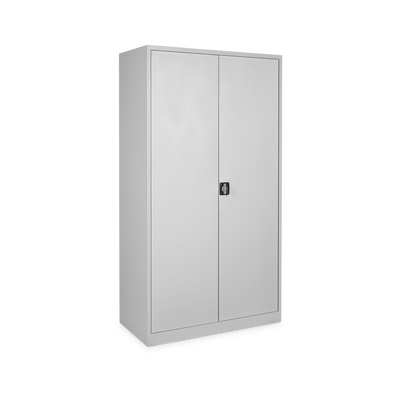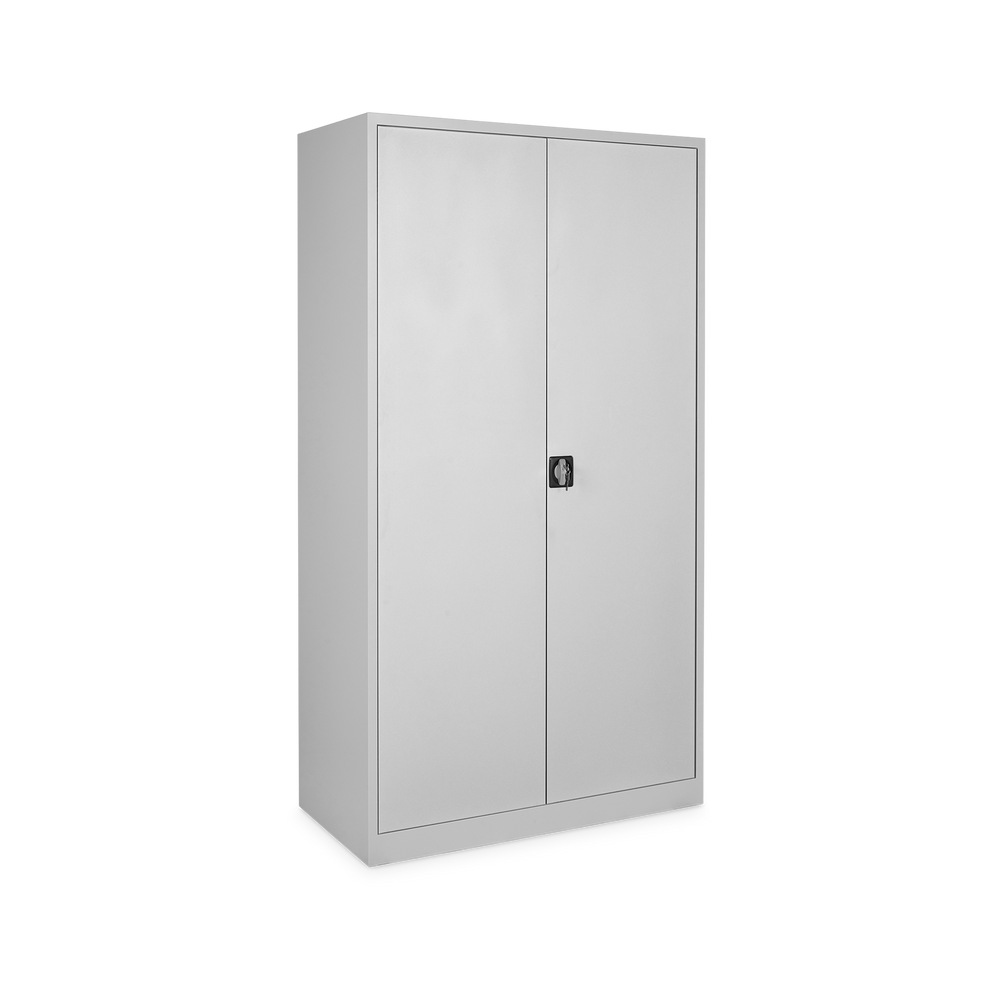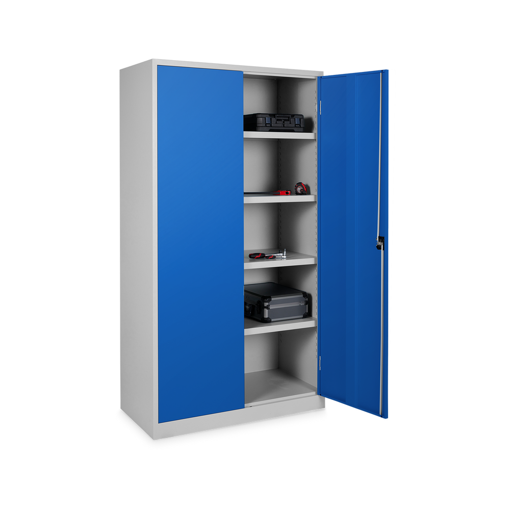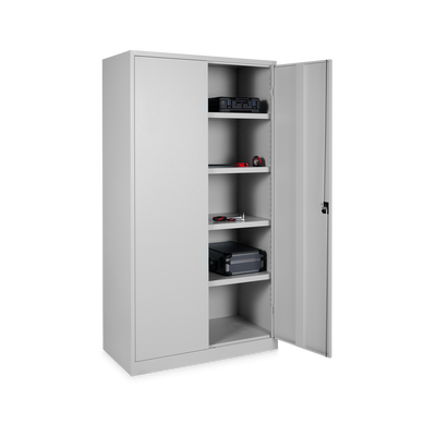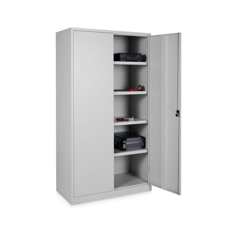 Der Schrank verfügt über 4 Fachböden, die im Raster von 35 mm höhenverstellbar sind und jeweils eine Traglast von bis zu 60 kg bieten. Der Schrank hat eine Höhe von 5 OH. Die verstärkten Flügeltüren (180° Türöffnung) sind mit geräuschdämpfenden Gummipuffern ausgestattet und schließen sicher durch ein Drehzylinderschloss.