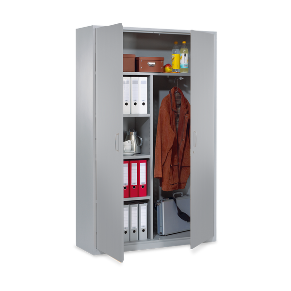 Der Aktenschrank kombiniert Stahl und Holz zu einem eleganten Möbelstück, das sich ideal als Raumteiler in Büros eignet. Die von innen justierbaren Stellfüße gewährleisten einen sicheren Stand, auch auf unebenen Böden. Metallbügelgriffe erleichtern die Handhabung und ein Zylinderschloss mit zwei Schlüsseln sichert den Inhalt.