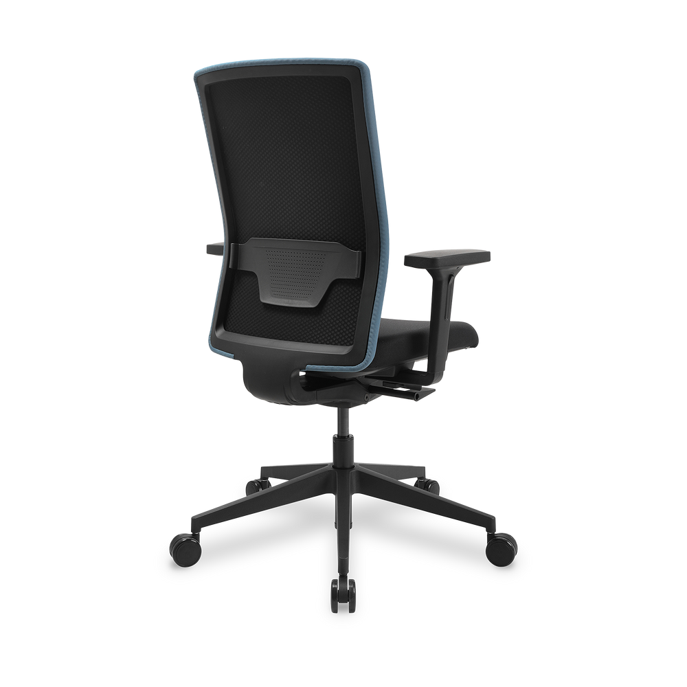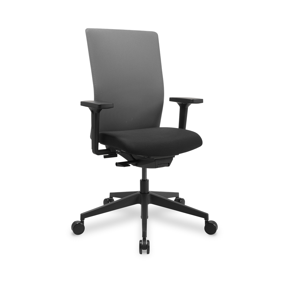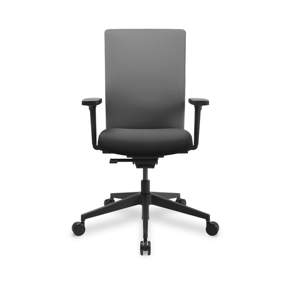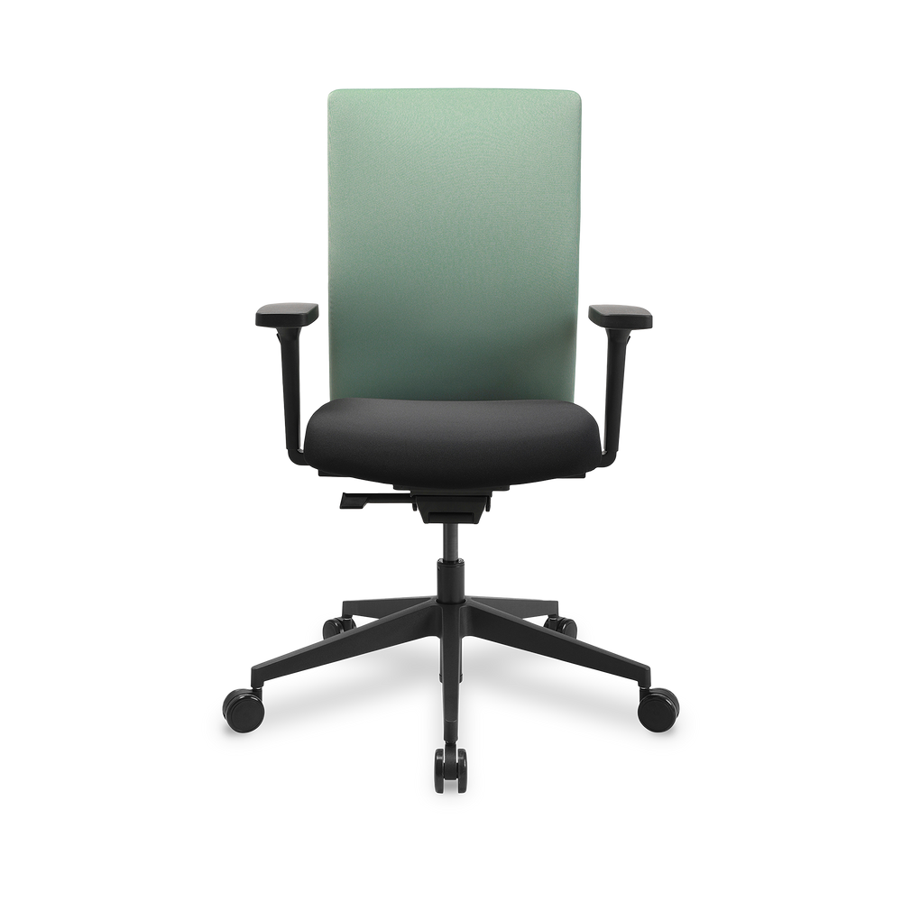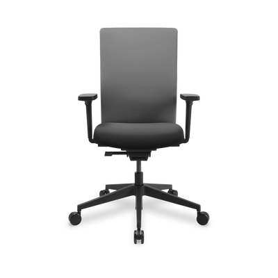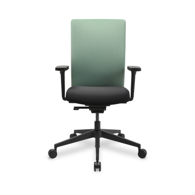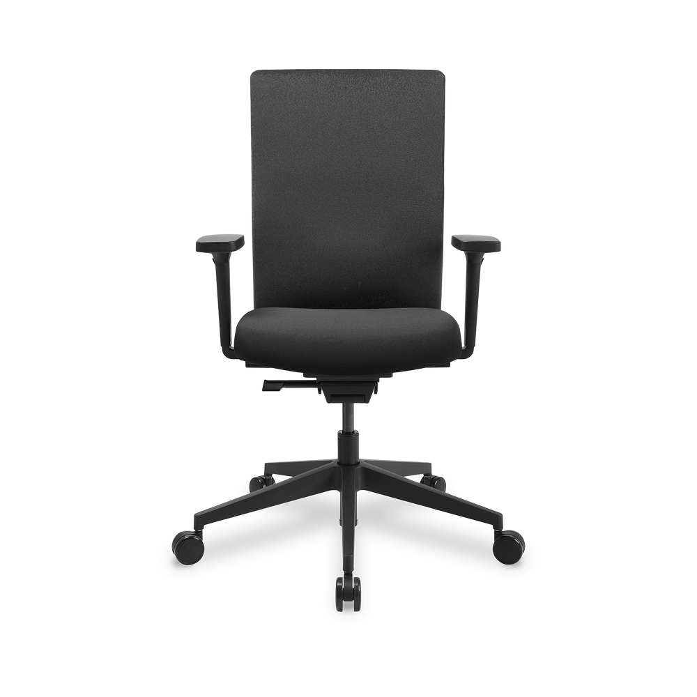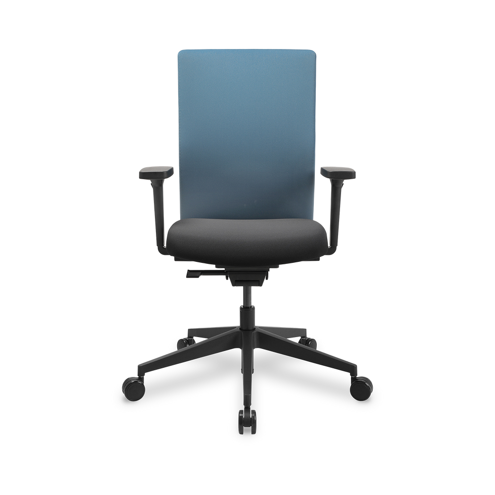 Der Bürostuhl steht auf einem Kunststofffußkreuz in schwarz und ist mit lastabhängig gebremsten Sicherheitsdoppelrollen für Teppichböden ausgestattet. Die höhenverstellbaren Armlehnen mit Softpad-Auflage bieten zusätzlichen Komfort und sind über einen Schnellverschluss in der Breite verstellbar.