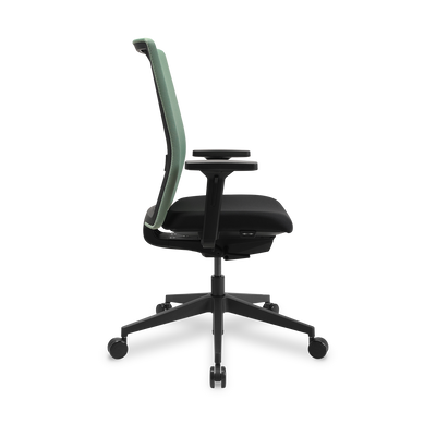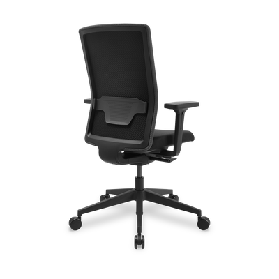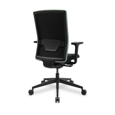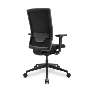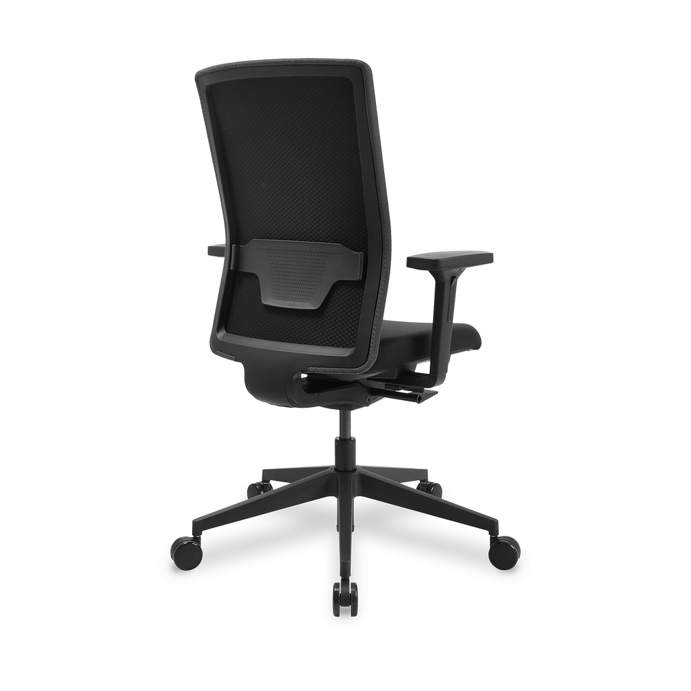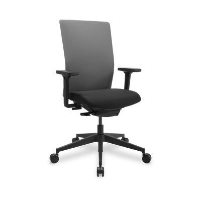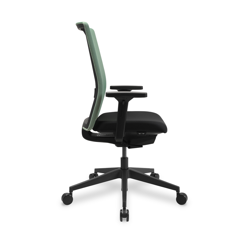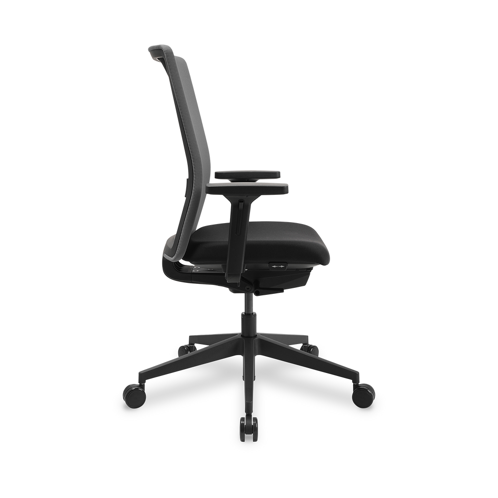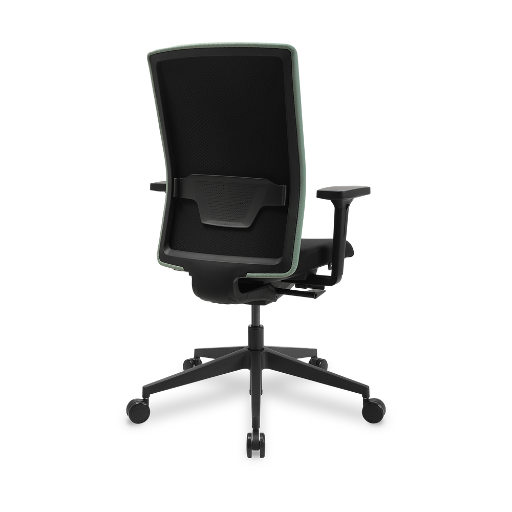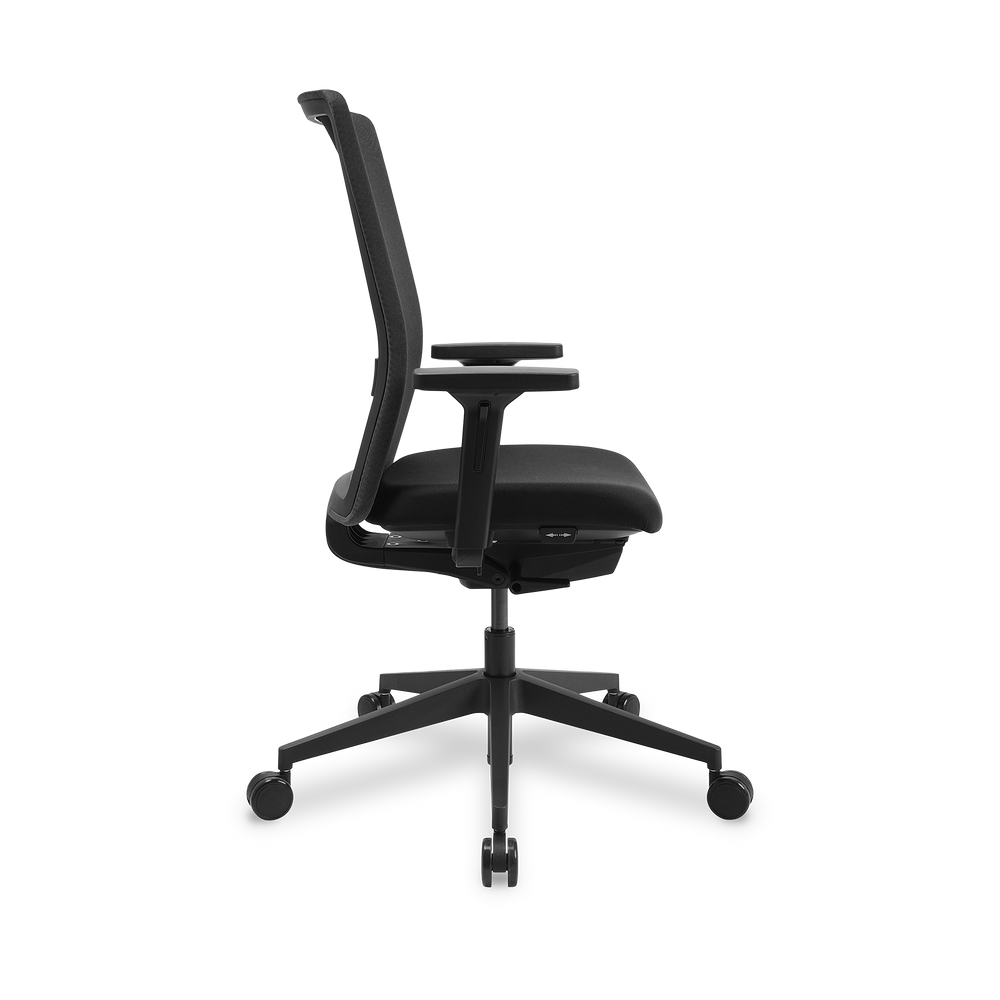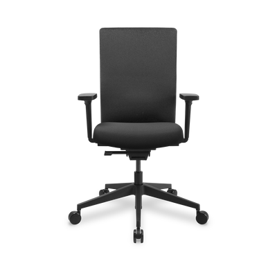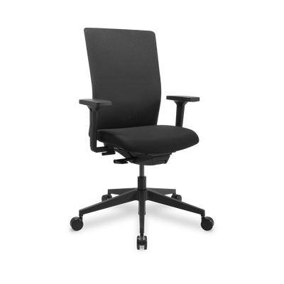 Der Bürostuhl steht auf einem Kunststofffußkreuz in schwarz und ist mit lastabhängig gebremsten Sicherheitsdoppelrollen für Teppichböden ausgestattet. Die höhenverstellbaren Armlehnen mit Softpad-Auflage bieten zusätzlichen Komfort und sind über einen Schnellverschluss in der Breite verstellbar.