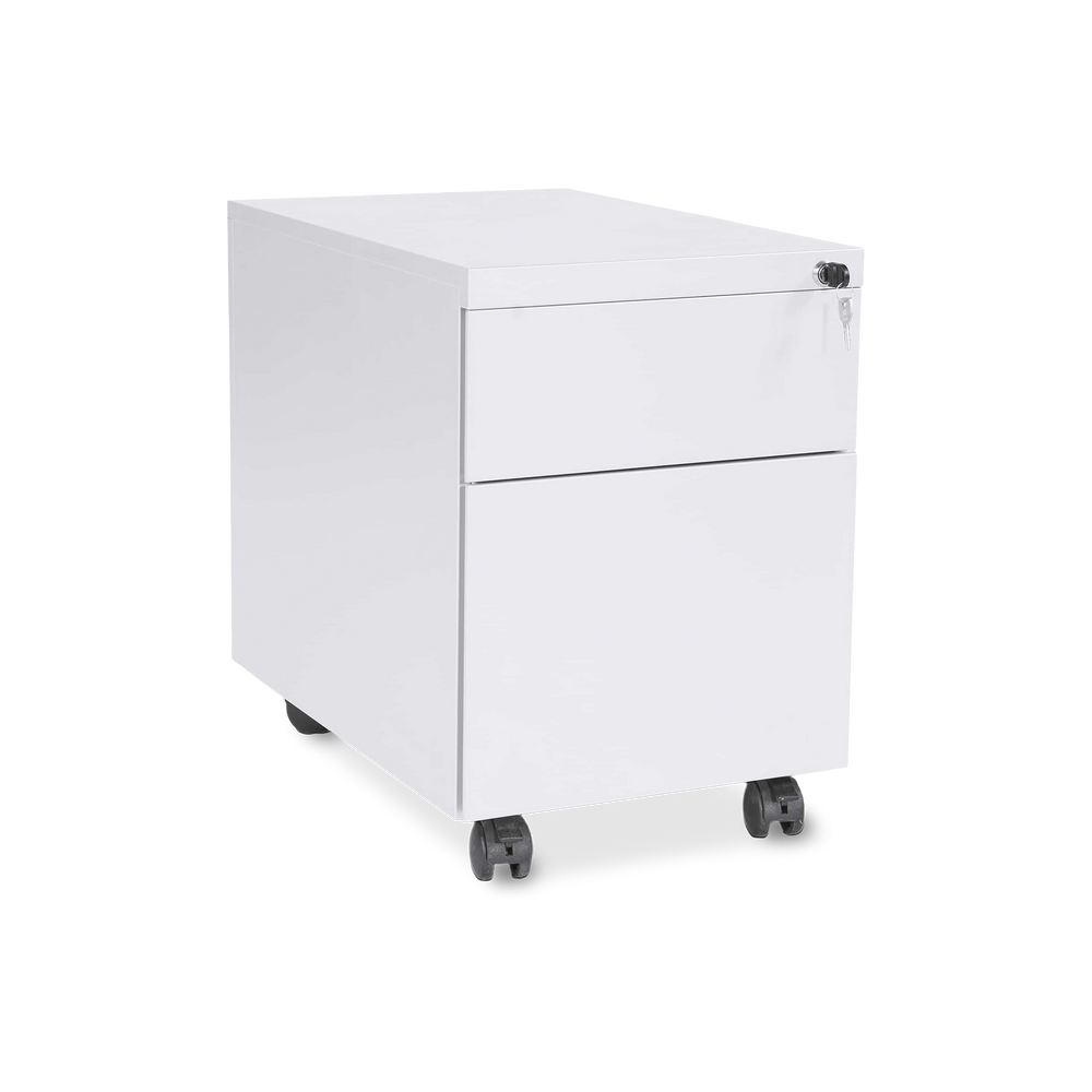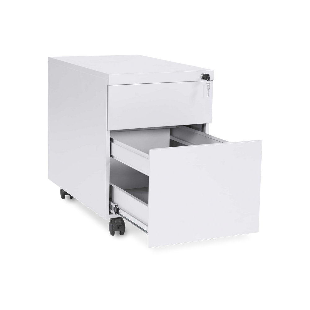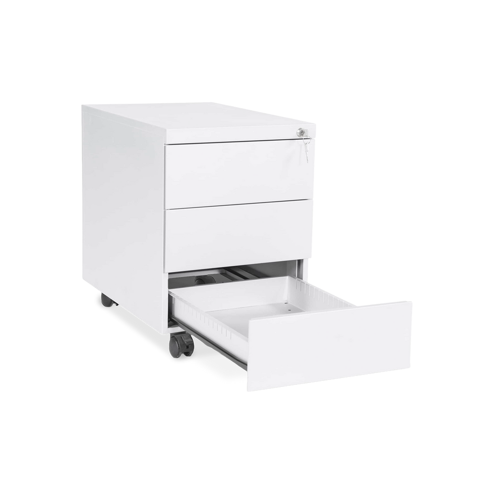 Der Design-Rollcontainer aus Stahl bietet eine elegante und funktionale Aufbewahrungslösung für Ihr Büro. Der verschweißte Stahlkorpus sorgt für Stabilität und Langlebigkeit, während die seitliche Griffleiste ein modernes Design unterstreicht.