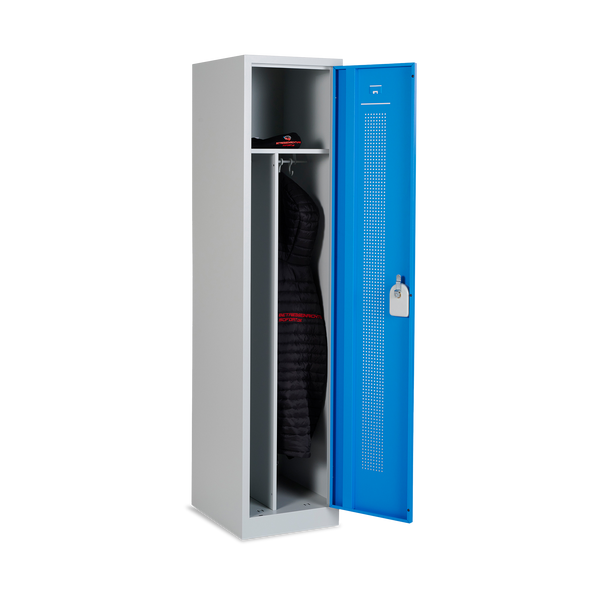 Im Inneren bietet der Spind eine praktische 2/3 zu 1/3 Trennwand-Einteilung, einen Hutboden, eine Kleiderstange mit Kleiderhaken sowie einen Schuhboden. Die Tür verfügt über einen Drehriegelverschluss für Vorhängeschlösser.