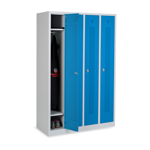 Design-Umkleidespind mit Lochreihen (3-Abteile) 870 mm Breite – Lichtgrau