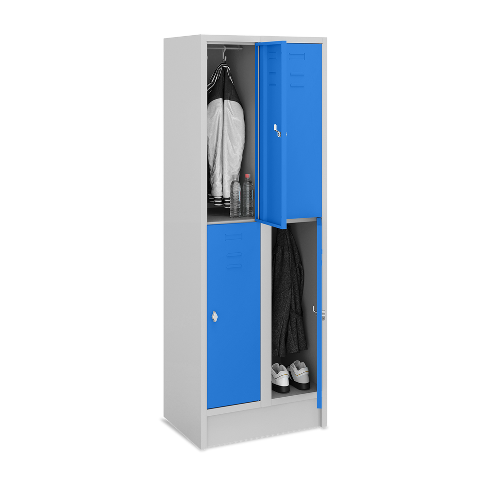 Die rechts angeschlagenen, einschlagenden Türen mit innenliegenden Scharnieren bieten zusätzlichen Schutz vor unbefugtem Zugriff. Jedes Fach ist mit einer Kleiderstange und praktischen Kunststoffhaken ausgestattet.