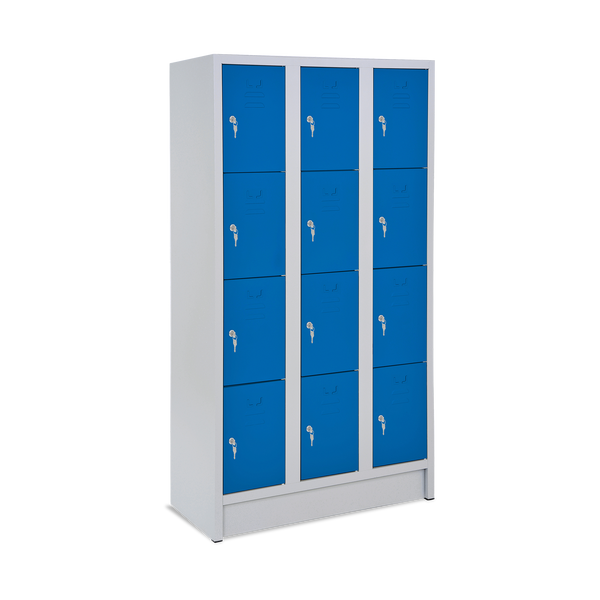 Der TÜV-geprüfte Fächerspind in Lichtgrau (RAL 7035) (Zertifikat Nr. S 60184163) ist die ideale Lösung für die sichere und organisierte Aufbewahrung in Schulen, Büros und öffentlichen Einrichtungen. Die robuste, verschweißte Konstruktion steht stabil auf einem Sockel und gewährleistet Langlebigkeit. Jede Tür ist mit einem Zylinderschloss und zwei Schlüsseln ausgestattet, um den Inhalt sicher zu schützen.