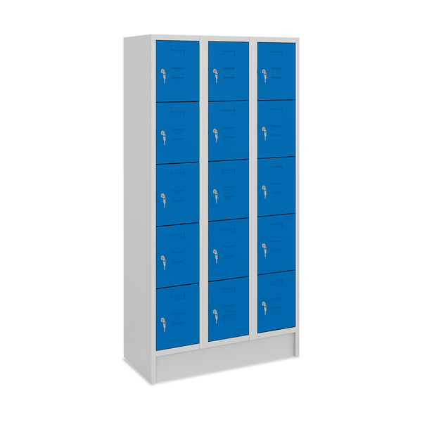 Der TÜV-geprüfte Fächerspind in Lichtgrau (RAL 7035) (Zertifikat Nr. S 60184163) ist die ideale Lösung für die sichere und organisierte Aufbewahrung in Schulen, Büros und öffentlichen Einrichtungen. Die robuste, verschweißte Konstruktion steht stabil auf einem Sockel und gewährleistet Langlebigkeit. Jede Tür ist mit einem Zylinderschloss und zwei Schlüsseln ausgestattet, um den Inhalt sicher zu schützen.