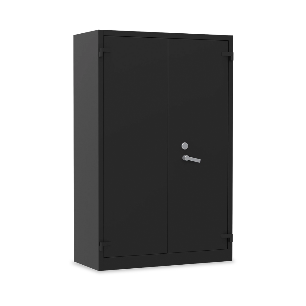 Mit den Maßen 550 mm Tiefe bietet der Schrank großzügigen Stauraum für bis zu maximal 50 Ordner (je nach Größe). Die vier höhenverstellbaren Fachböden ermöglichen eine flexible Organisation Ihrer Dokumente. Die Türen sind in stabilen Drehbolzen gelagert und lassen sich beidseitig um 180° öffnen, was einen komfortablen Zugriff gewährleistet. Ein hochwertiges Spezialschloss aus Deutschland sichert Ihre vertraulichen Unterlagen. Es verfügt über eine 3-Punkt-Verriegelung mit insgesamt fünf Bolzen (drei seitlich, einer oben, einer unten) und wird mit zwei Schlüsseln geliefert.