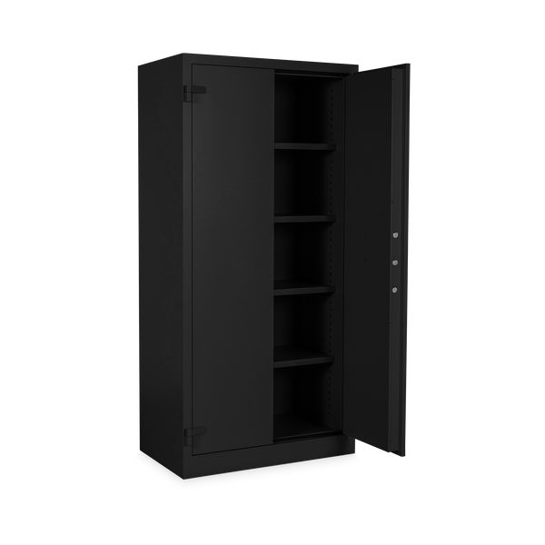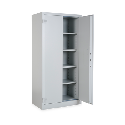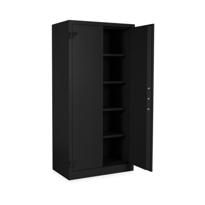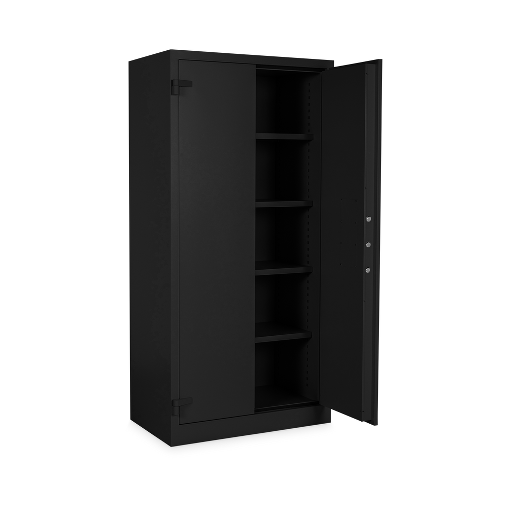 Mit den Maßen 550 mm Tiefe bietet der Schrank großzügigen Stauraum für bis zu maximal 50 Ordner (je nach Größe). Die vier höhenverstellbaren Fachböden ermöglichen eine flexible Organisation Ihrer Dokumente. Die Türen sind in stabilen Drehbolzen gelagert und lassen sich beidseitig um 180° öffnen, was einen komfortablen Zugriff gewährleistet. Ein hochwertiges Spezialschloss aus Deutschland sichert Ihre vertraulichen Unterlagen. Es verfügt über eine 3-Punkt-Verriegelung mit insgesamt fünf Bolzen (drei seitlich, einer oben, einer unten) und wird mit zwei Schlüsseln geliefert.
