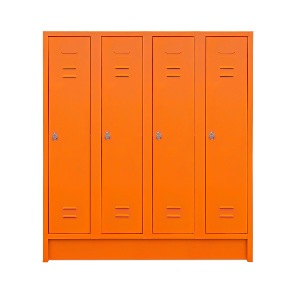 Der bunte Kindergartenspind (Druchgängige Abteile) mit 4 Abteilen bietet eine praktische und sichere Aufbewahrungslösung, ideal für Kindergärten und andere Einrichtungen. Jedes Abteil ist 300 mm breit und ausgestattet mit einer Kleiderstange und zwei Haken. So finden Kleidung und persönliche Gegenstände ausreichend Platz.