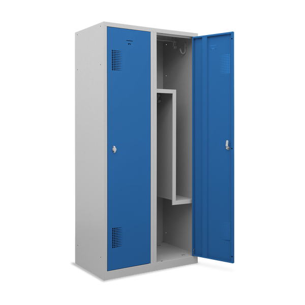 Der TÜV geprüfte Kleiderspind (Stahl) (Zertifikat Nr. S 60184163) mit SW-Trennung und Z-Einteilung mit zwei Abteilen ist die ideale Lösung für Umkleideräume, die sowohl Funktionalität als auch ein modernes Design erfordern. Die stabile Stahlkonstruktion mit pulverbeschichteter Oberfläche in Lichtgrau (RAL 7035) für den Korpus und wahlweise Lichtgrau (RAL 7035) oder Enzianblau (RAL 5010) für die Türen gewährleistet Langlebigkeit und Robustheit.
