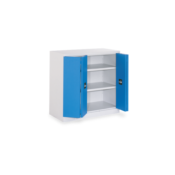 Die verstärkten Türen lassen sich per Drehzylinderschloss mit zwei Schlüsseln sicher verschließen. Im Inneren befinden sich gelochte, pulverbeschichtete Fachböden, die im 36 mm Raster verstellbar sind und flexible Lagermöglichkeiten bieten.