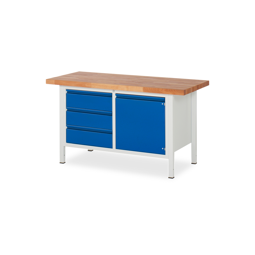 Die Profi-Werkbank der Serie BASIC-8 kombiniert die hochwertige 40 mm Buchen-Massivholzplatte (PEFC-zertifiziert) mit einer asymmetrischen, voll abschließbaren Stauraumlösung für maximale Funktionalität. Der stabile Schweißrahmen aus Profil-Stahlrohr (45x45x2 mm) bildet die robuste Basis für anspruchsvolle Arbeiten.