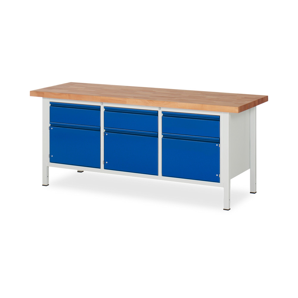 Diese Profi-Werkbank der Serie BASIC-8 verfügt über eine 40 mm Buche-Massiv-Arbeitsplatte (PEFC-zertifiziert) und einen einzigen, durchgehenden Dreifach-Unterbau-Container (B1700 mm) für maximalen, organisierten und abschließbaren Stauraum. Sie steht auf einem stabilen 4-Fuß Schweißgestell aus Profil-Stahlrohr (45x45x2 mm).
