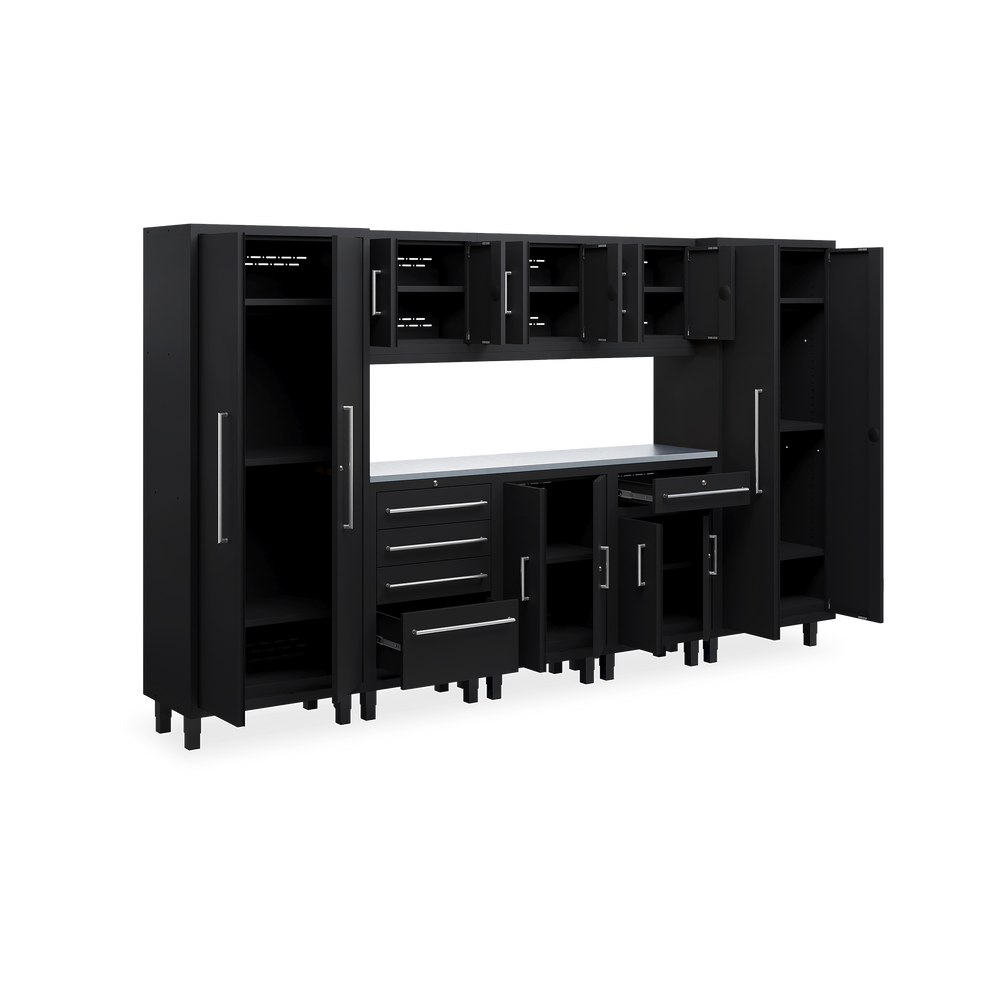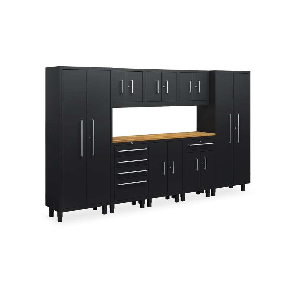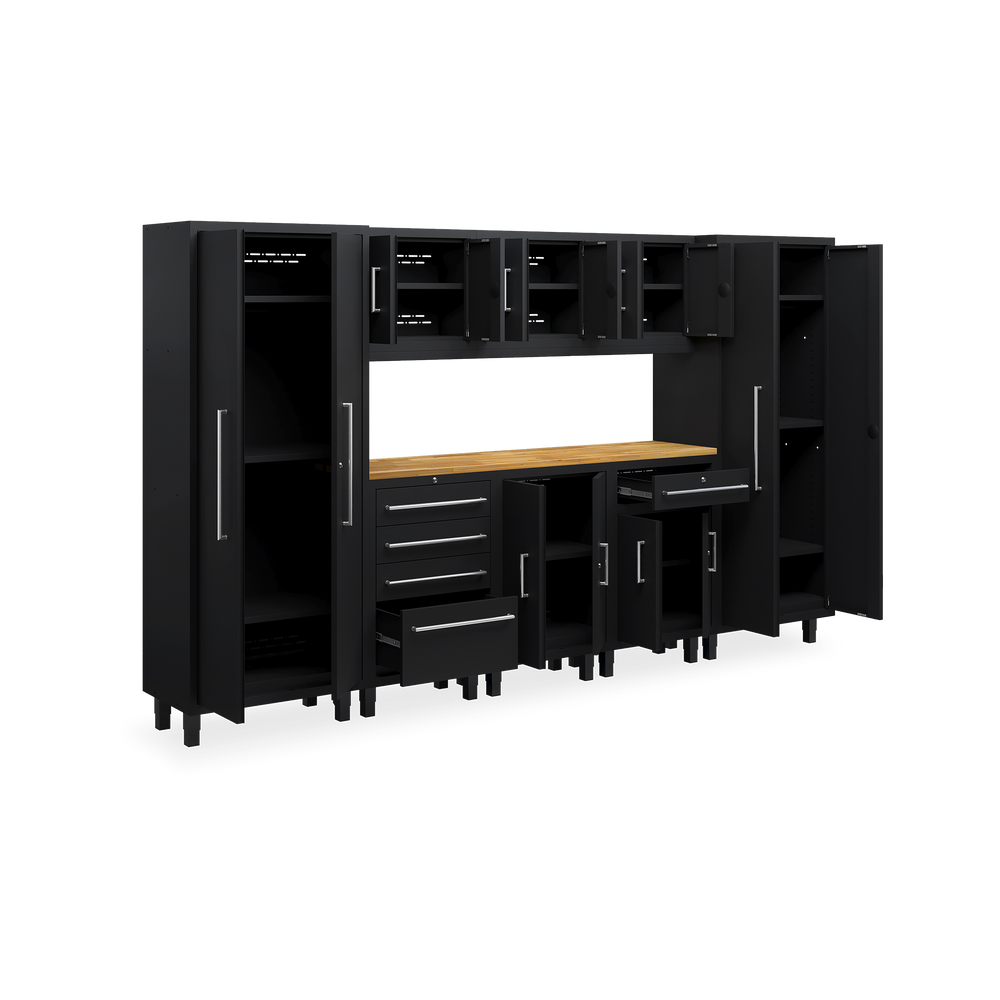 Das Essential-Set 9 ist eine umfassende Lösung für die organisierte Werkstatt und umfasst sechs hochwertige Möbelstücke: zwei Werkstattschränke (915 mm), drei Hängeschränke, einen Schubladenschrank und einen Unterschrank. Alle Elemente sind in elegantem Tiefschwarz (RAL 9005) gehalten und fügen sich optisch harmonisch in jede Arbeitsumgebung ein.