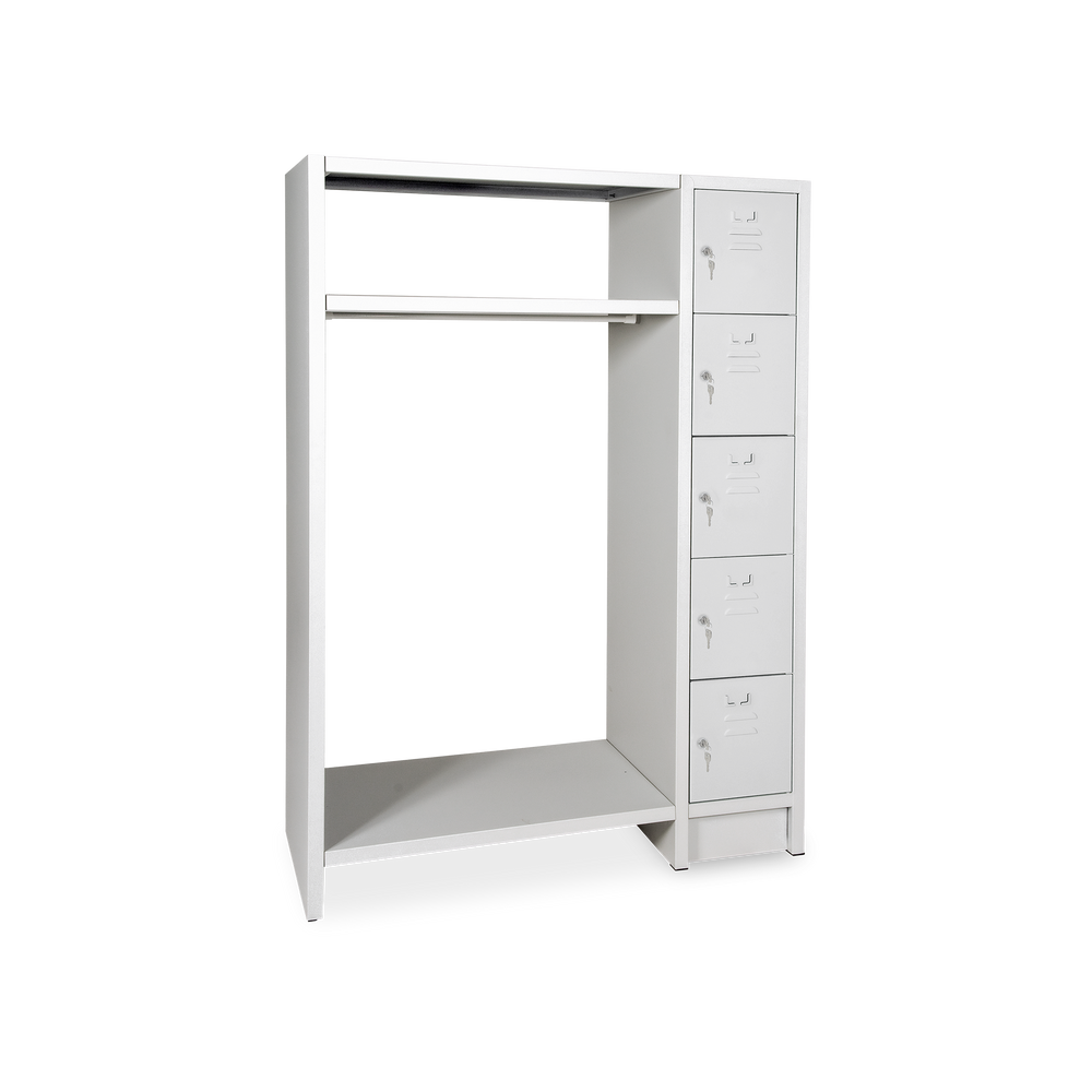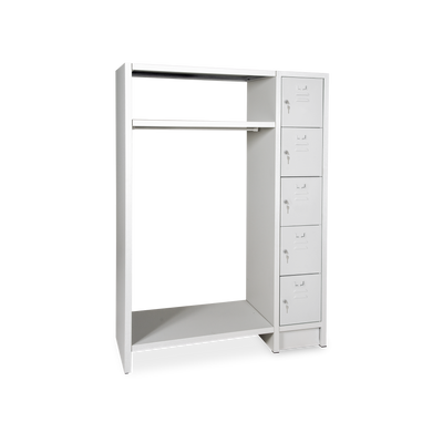 Diese Schließfachgarderobe (der Fächerspind ist TÜV geprüft, Zertifikat Nr. S 60184163) in Lichtgrau (RAL 7035) bietet mit 5 Fächern ausreichend Stauraum für Kleidung und persönliche Gegenstände. Die verschweißten Seitenteile und die stabile Kleiderstange gewährleisten eine hohe Stabilität und Langlebigkeit. Jedes Fach ist mittels Zylinderschloss inkl. zwei Schlüsseln sicher verschließbar.