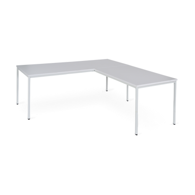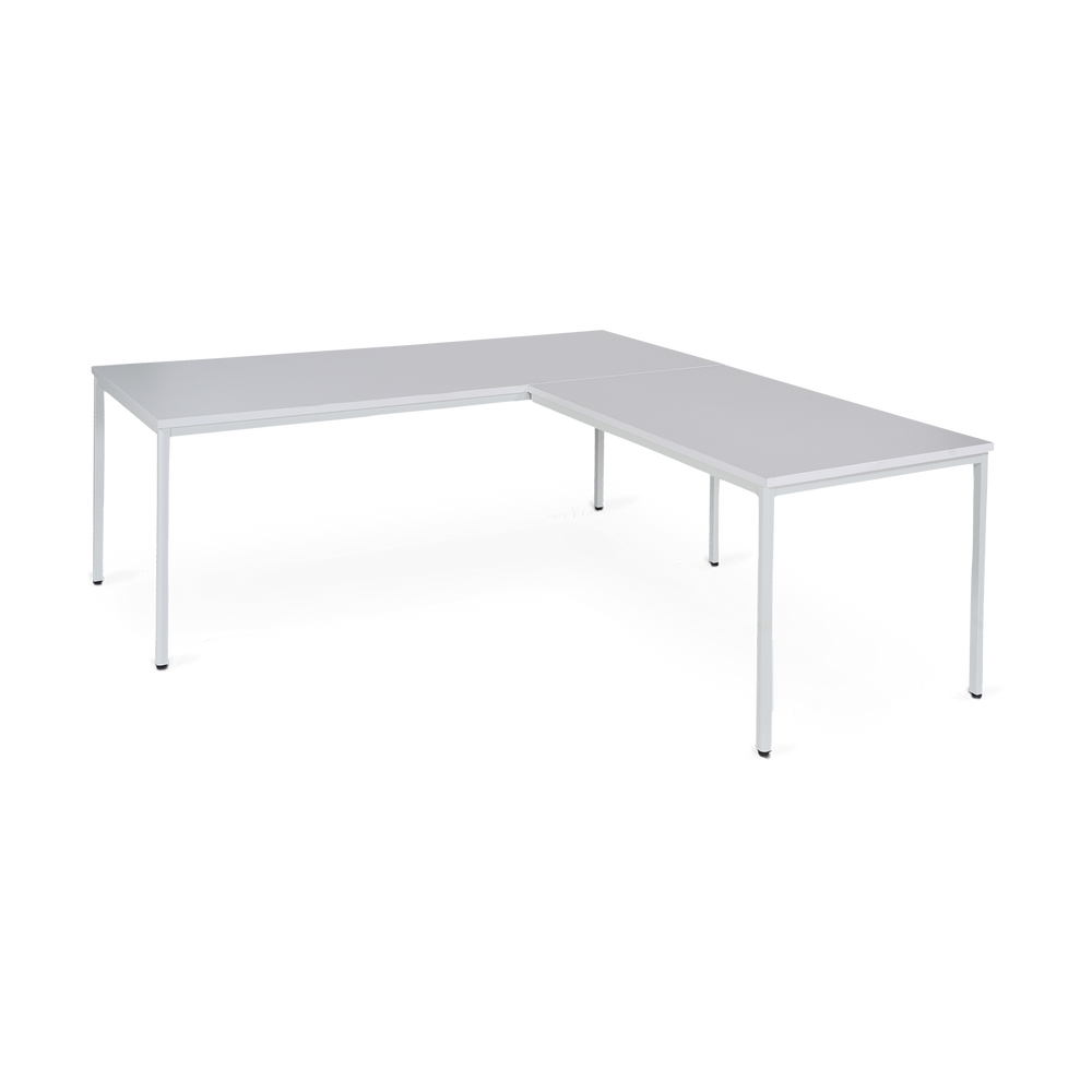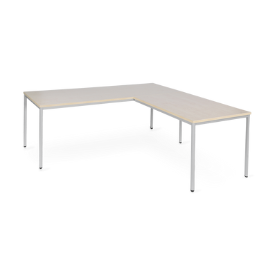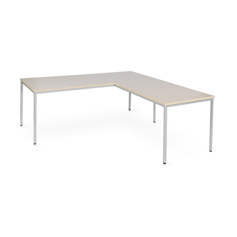 Dieser Schreibtisch in Winkelkombination bietet Ihnen eine optimale Raumnutzung und eine großzügige Arbeitsfläche, ideal für Büros und Arbeitszimmer. Die Kombination aus grauem Gestell und ahornfarbener Tischplatte sorgt für eine moderne und freundliche Atmosphäre.