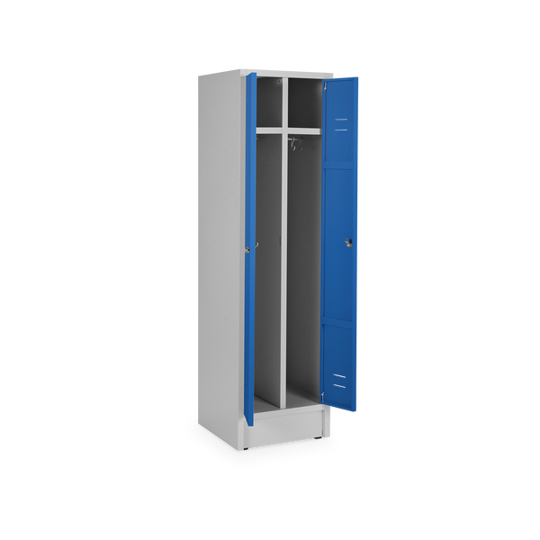 Dieser TÜV geprüfte Doppelspind ohne Fachböden (Zertifikat Nr. S 60184163) ist die ideale Lösung zur Aufbewahrung von Kleidung und persönlichen Gegenständen in Umkleideräumen, Schulen oder Betrieben. Er verfügt über zwei Abteile mit je einem Hutboden und einer Kleiderstange aus Metall mit zwe verschiebbaren Kleiderhaken aus Kunststoff.