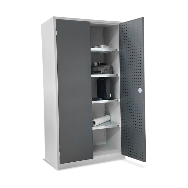 Die Lochplattenverkleidung an der Türinnenseite ermöglicht eine optimale Organisation Ihrer Werkzeuge und Geräte. Die Türscharniere mit 180° Öffnung ermöglichen einen einfachen und bequemen Zugriff auf den Inhalt des Schranks.
