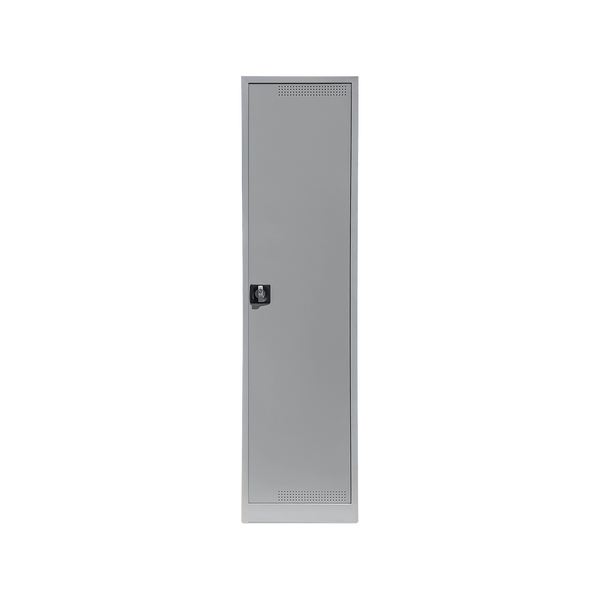 Lüftungslöcher sorgen für optimale Luftzirkulation. Die verstärkte Türinnenseite mit Metalltasche bietet Platz für Gefahrenhinweise. Vier verstellbare, verzinkte Wannen mit einer Tragkraft von bis zu 80 kg bieten ausreichend Stauraum. Ein hochwertiges Drehzylinderschloss mit zwei Schlüsseln schützt den Inhalt.