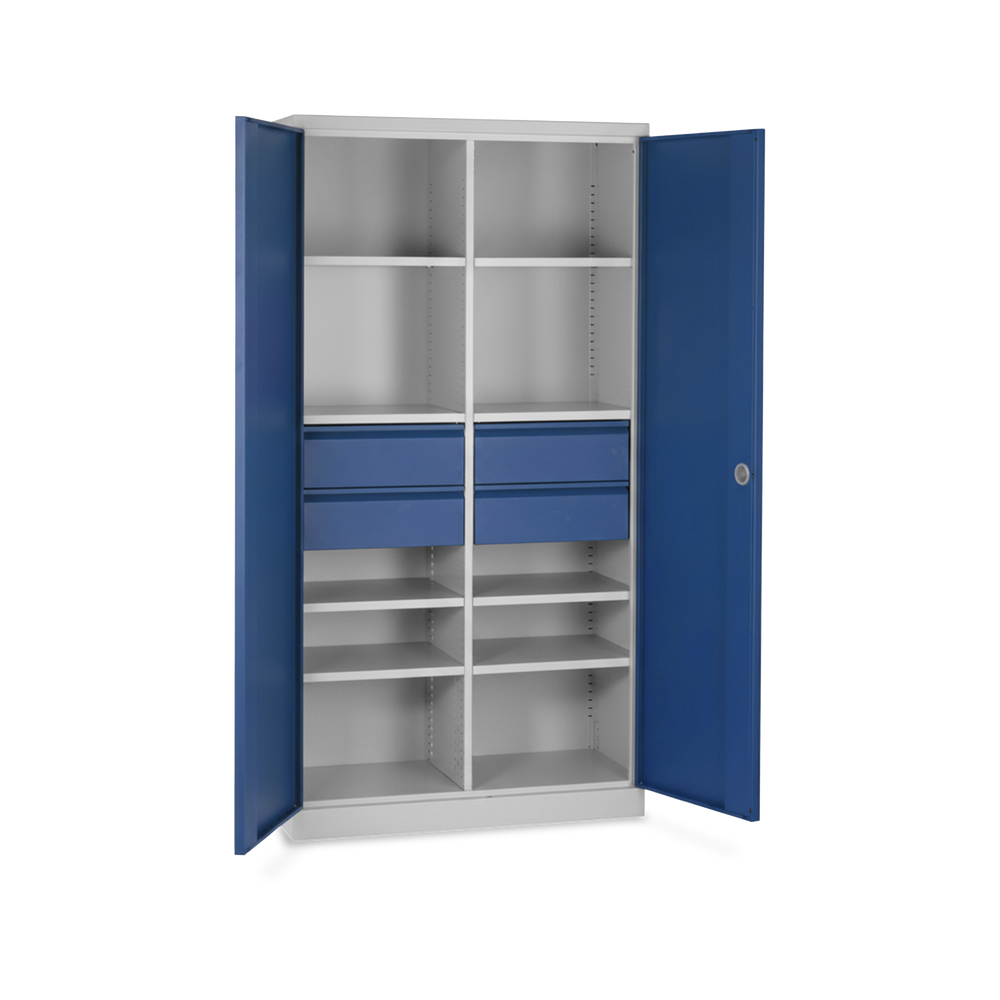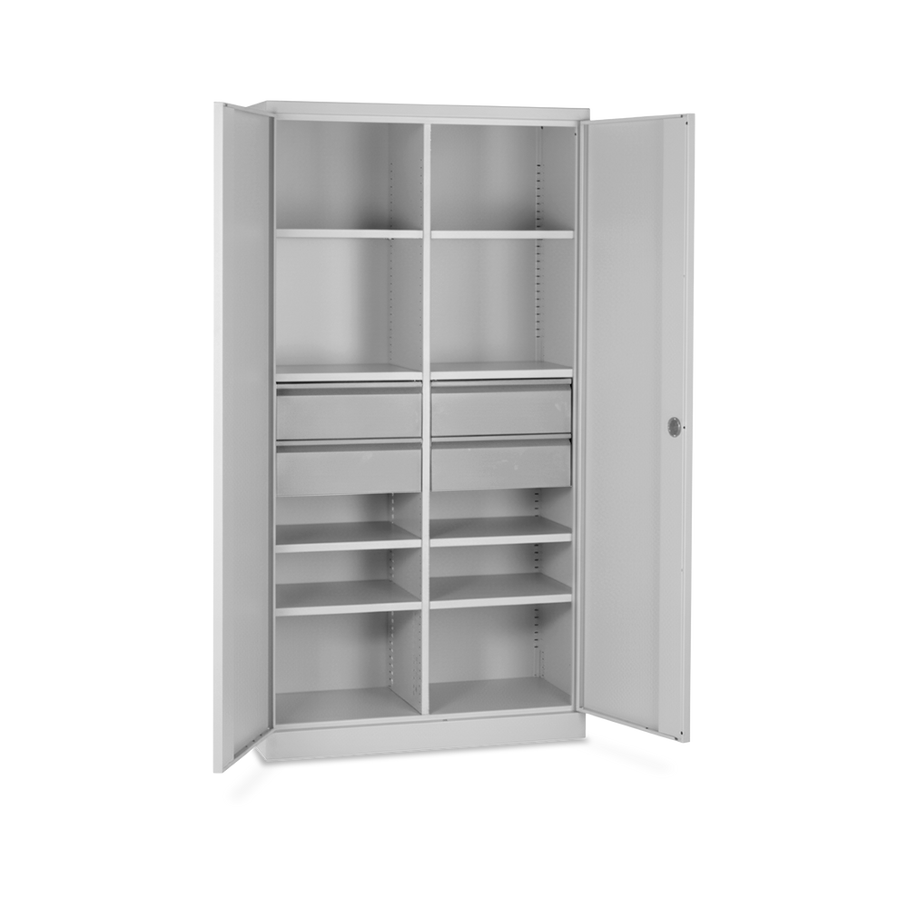 Im Inneren sorgt eine Mitteltrennwand für eine klare Aufteilung des Stauraums. Die Ausstattung umfasst 8 verstellbare Fachböden sowie 4 Schubladen. Diese Flexibilität ermöglicht eine präzise Anpassung an unterschiedliche Lagergüter. Die Flügeltüren sind über ein Zylinderschloss (inkl. zwei Schlüssel) sicher verschließbar und schützen den Inhalt vor unbefugtem Zugriff.